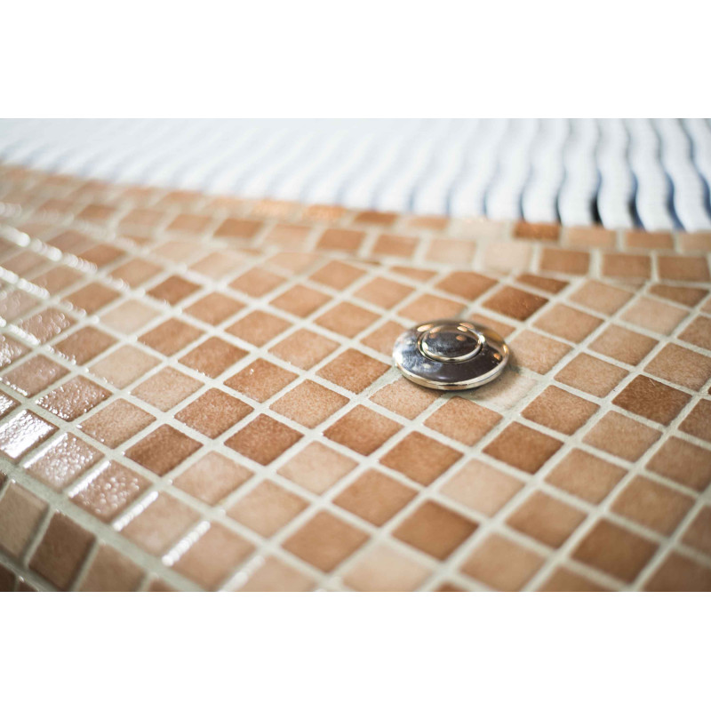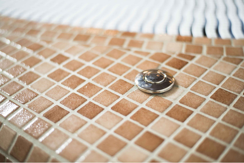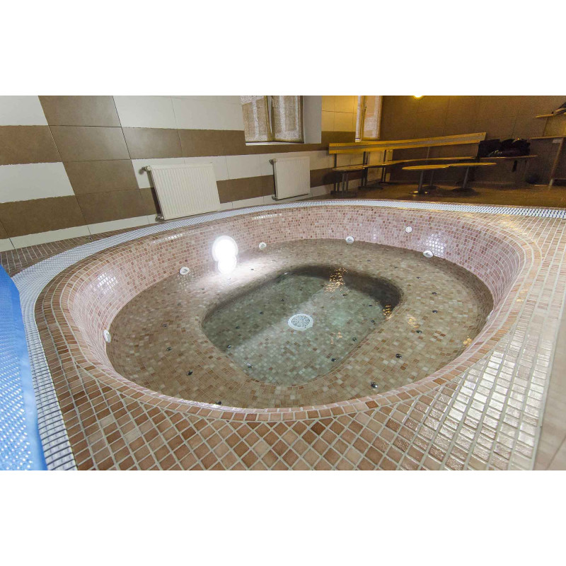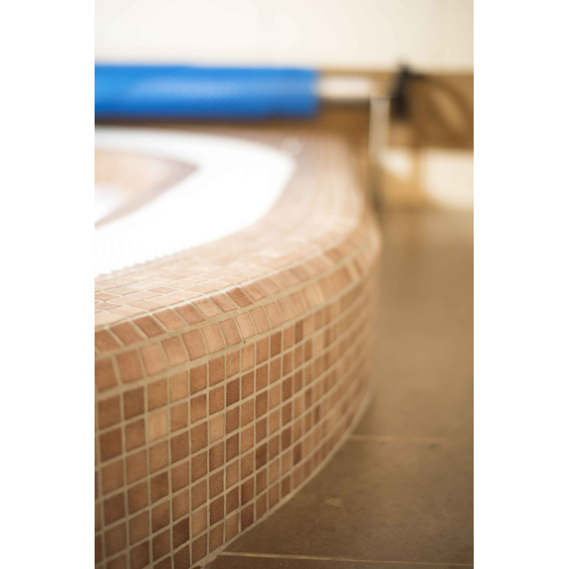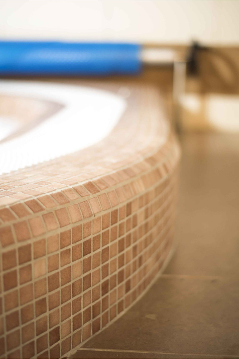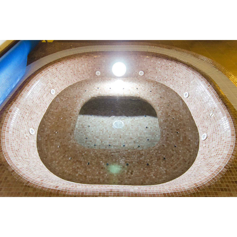 - Flīzes - baseina iekšpuse un ārpuse ir pārklāta ar neitrālas krāsas šķembu stikla mozaīku.