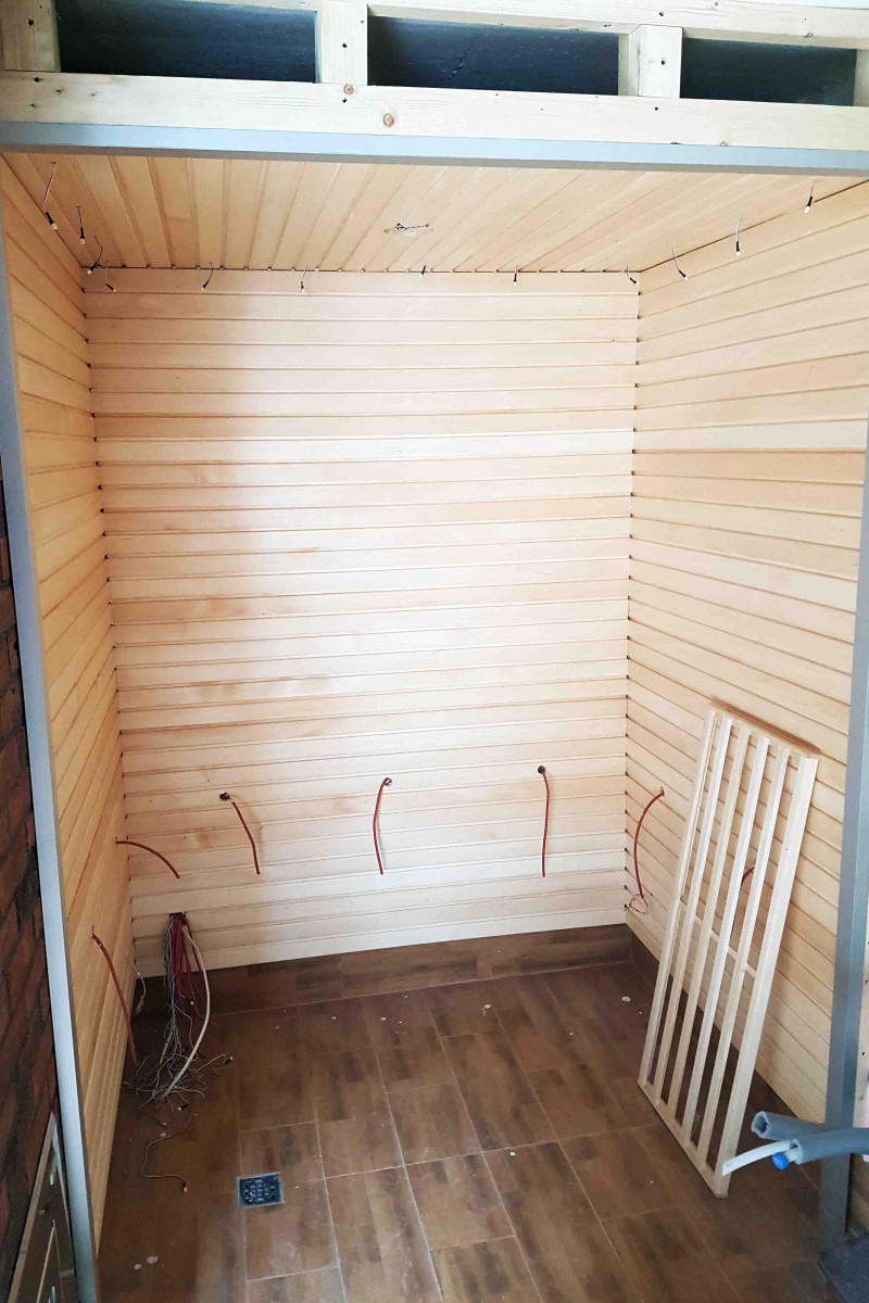 Pirts iekšējā apdare ir liepas koka lāvas, sienas, griesti un grīdas restes. Soliņi ir piesūcināti ar speciālu parafīna eļļu. Eļļa aizsargā koka virsmu no mitruma iedarbības, padarot koksni vieglāk tīrāmu un kopjamu. Sienas lakotas ar ūdens vannas laku, kas pasargā no netīrumu, ūdens un sārmu iedarbības.
