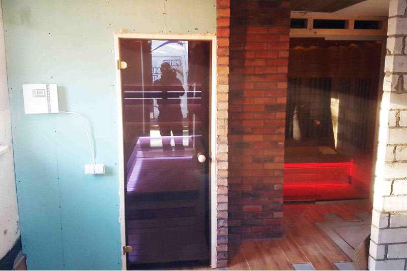 Pirts apgaismojums - LED "Saulė" - 12 spuldzes griestos, izturīgas pret mitrumu un temperatūru. Zem soliem omulīgas atmosfēras radīšanai - krāsu RGB apgaismojums, ko vada bezvadu krāsu mainītājs.