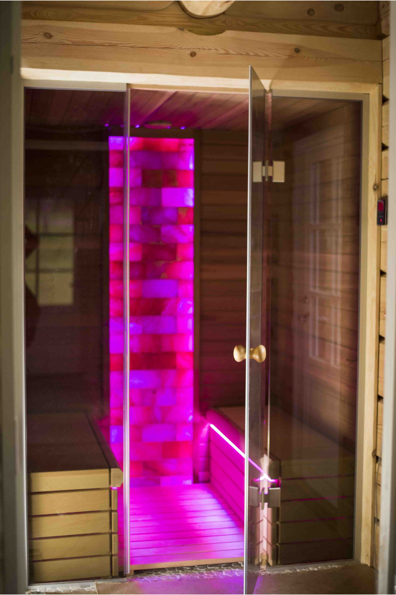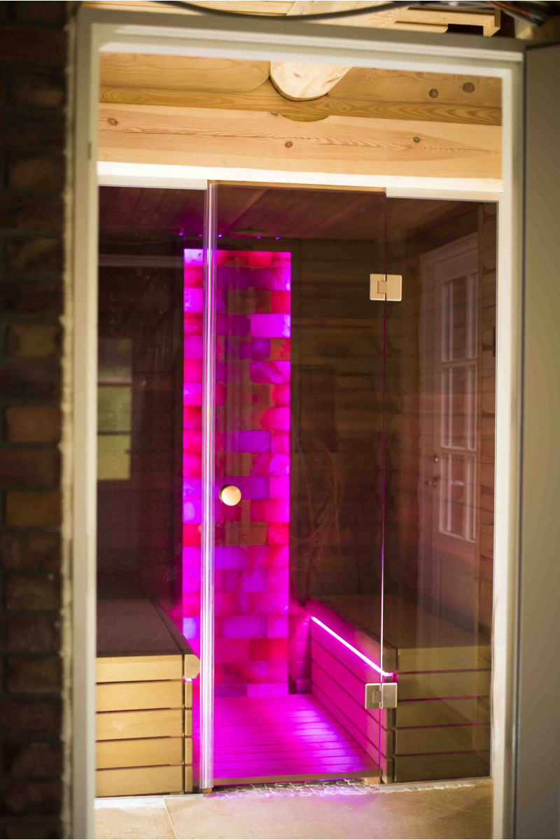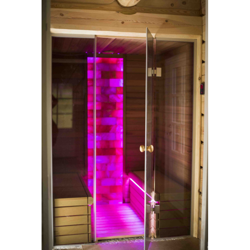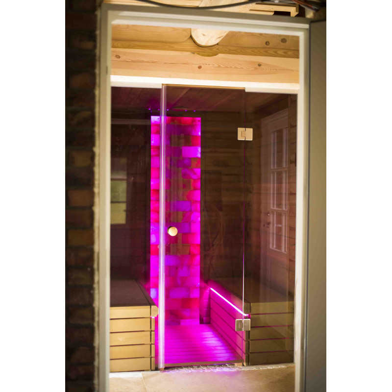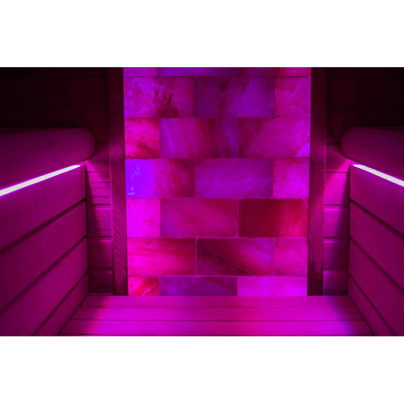 Pirts apdarei izvēlētā Himalaju sālsķieģeļu siena ar iebūvēto krāsaino RGB apgaismojumu, ko vada bezvadu krāsu mainītājs, rada mājīgu vidi un vēl vairāk pastiprina pirts efektu.