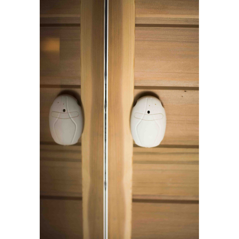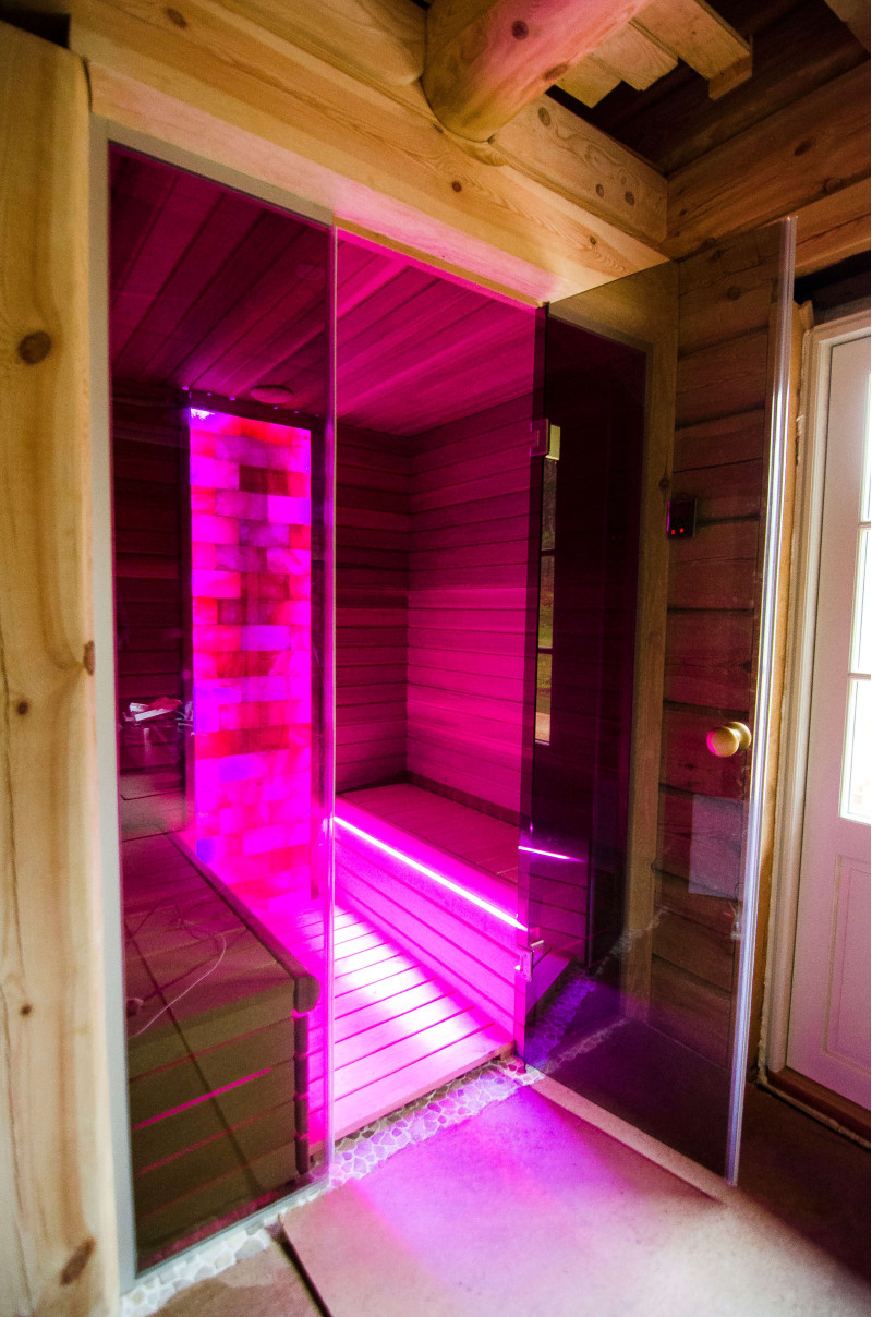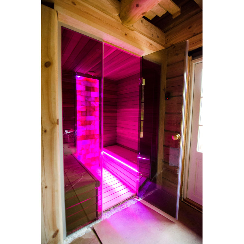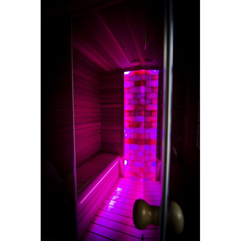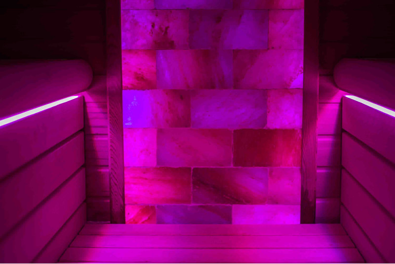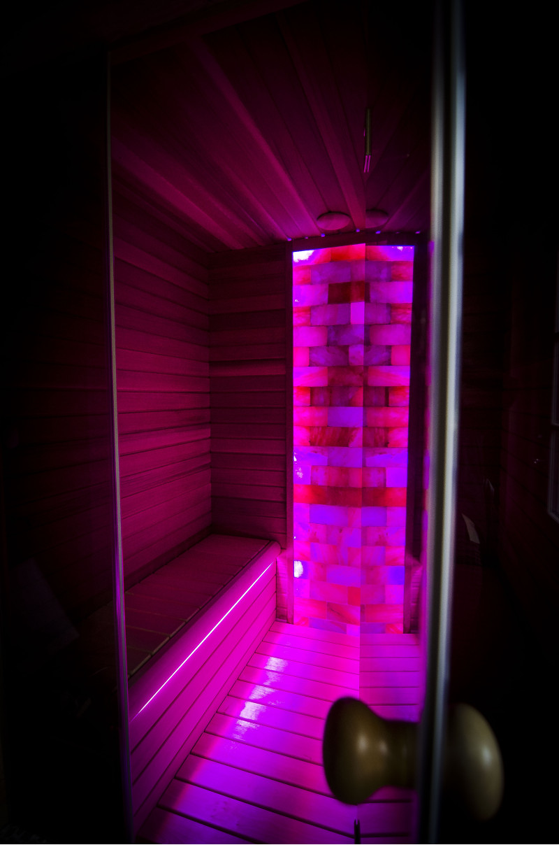 Pirts apdarei izvēlētā Himalaju sālsķieģeļu siena ar iebūvēto krāsaino RGB apgaismojumu, ko vada bezvadu krāsu mainītājs, rada mājīgu vidi un vēl vairāk pastiprina pirts efektu.