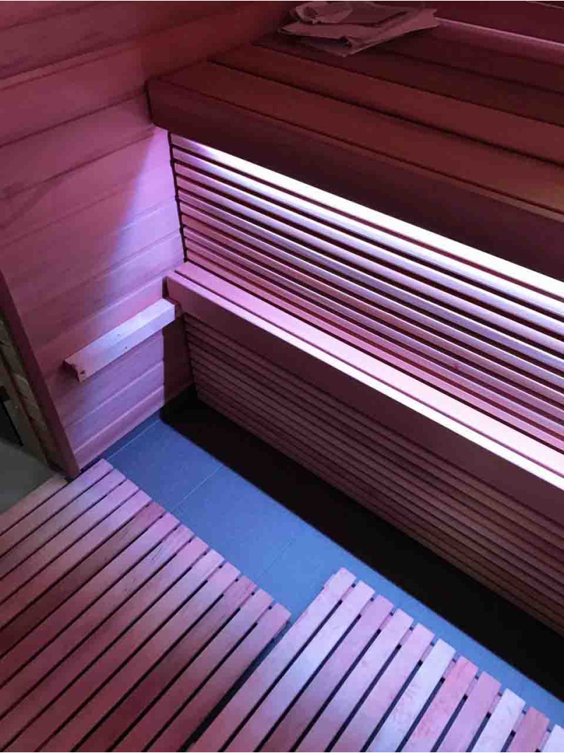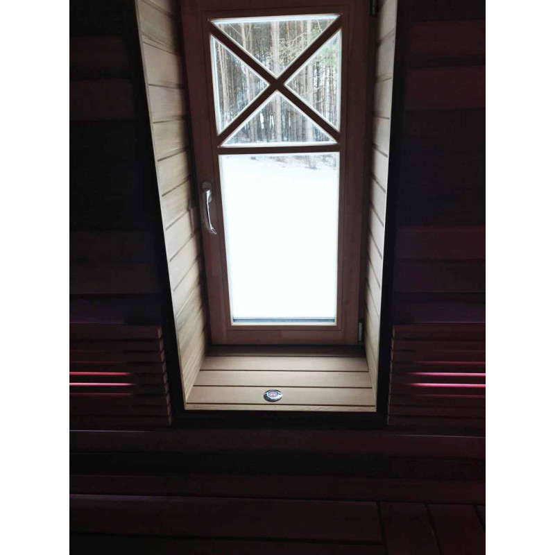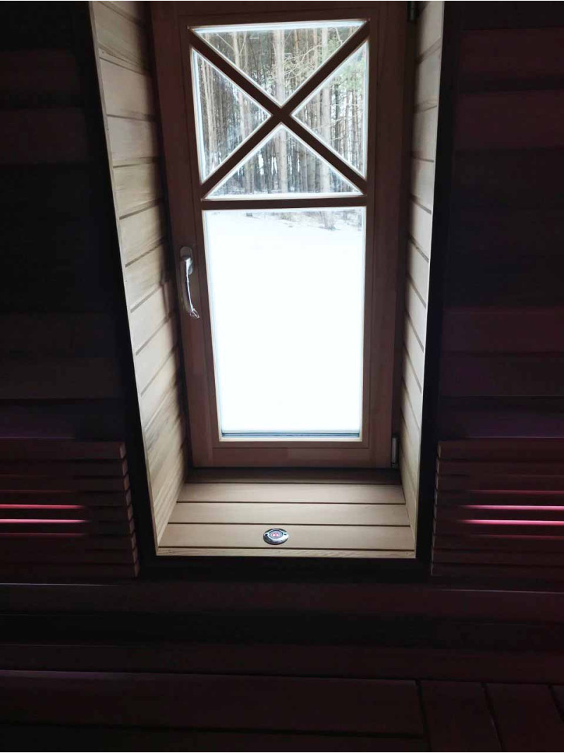 - Salona apdare un sauļošanās krēsli izgatavoti no augstākās kvalitātes ciedra koka - nedegošs korpuss. Gultas no nestandarta platākiem dēļiem - ērtākai peldēšanai. Atzveltnes un krāsns korpusa aizsardzība - abachi siksnas.