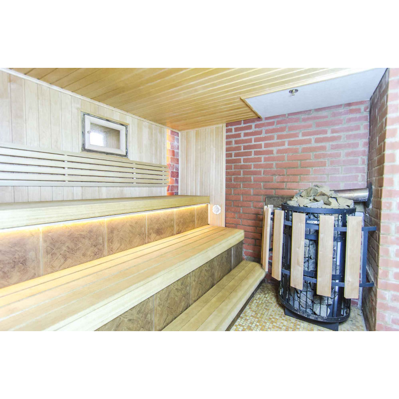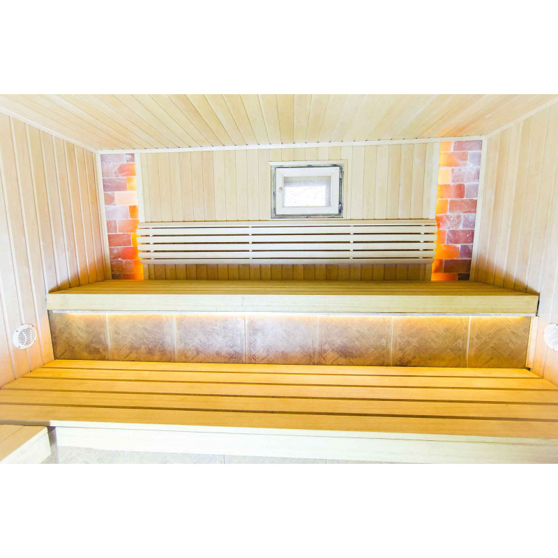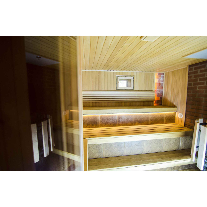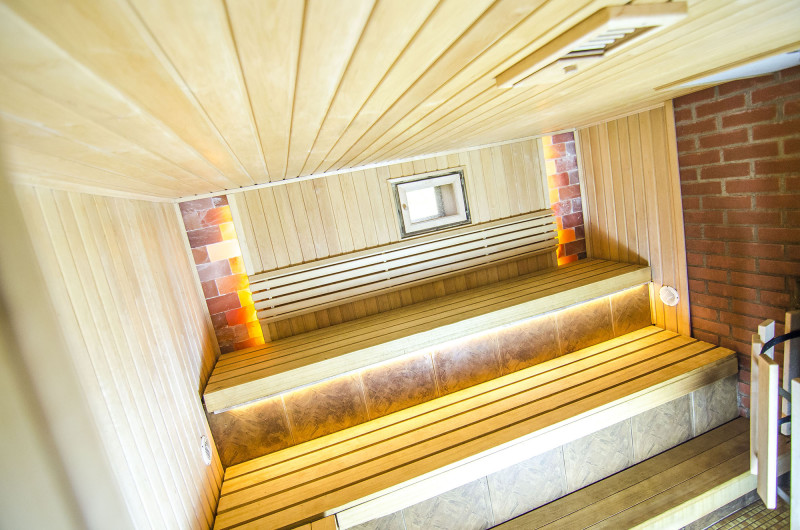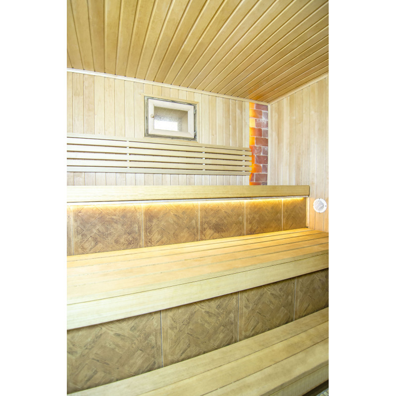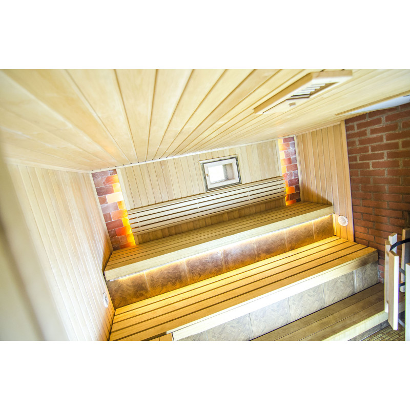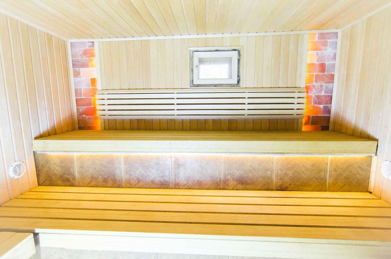 Sienām un griestiem izvēlēts plats melnalkšņa apšuvums. Soliņi tika izgatavoti no kvalitatīva nesildoša abača koka, tāpēc uz šādiem soliem ir patīkami sēdēt vai gulēt, neapdedzinot ādu. Zem soliem uzstādīts LED apgaismojums.