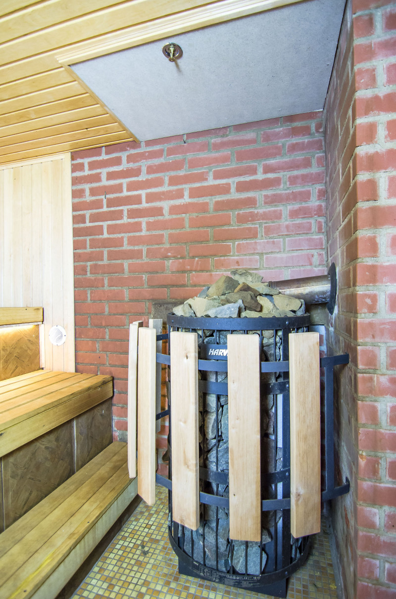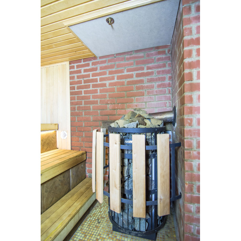 Mainīta pirts apkures iekārta. Ar rokām darinātais sildītājs ir pārveidots par malkas kurināmo Harvia Legend 300 Duo ar ārējo kurtuvi, kas satur lielu daudzumu akmeņu, ļaujot izbaudīt to izstaroto siltumu pat tad, ja nav augstas temperatūras. Griesti ir aprīkoti ar ugunsdrošības sistēmu - plātņu Minerit Sauna, sprinkleru. Ap sildītāju ir uzstādīta koka un metāla aizsargājoša apmale.