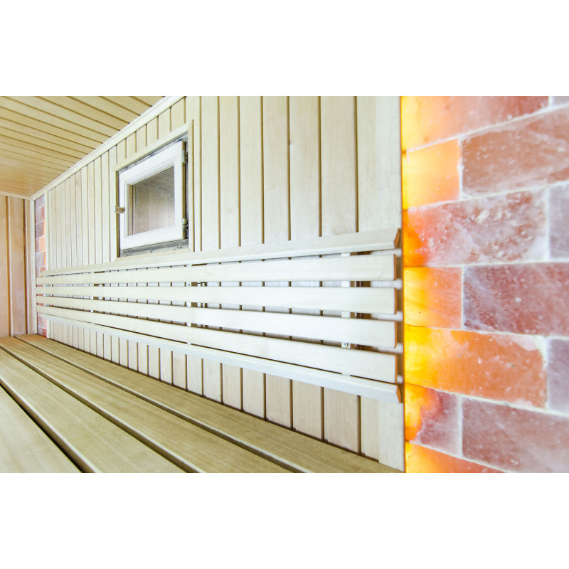 Pirts apdarei izvēlēts izcils dekoratīvs elements - Himalaju sāls bloki. Himalaju sāls ne tikai lieliski izskatās, bet arī uzlabo iekštelpu gaisa kvalitāti, mazina alerģiju un astmas simptomus, paaugstina garastāvokli un sniedz enerģiju, neitralizē elektromagnētisko starojumu, samazina statisko elektrību gaisā. Aiz sāls blokiem iebūvētais LED apgaismojums rada vēl mājīgāku vidi pirtī un akcentē Himalaju sāls bloku izskatu.