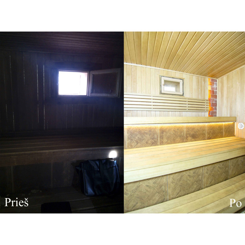 Nomainīts logs - koka rāmis, rūdīts stikls. Nolietotās pirts durvis nomainītas pret jaunām - īpaši paredzētas pirtīm ar rūdīta stikla un koka karkasu. Šis stikls ir termiski apstrādāts, 5 reizes stiprāks nekā parasti. Rāmis ir izgatavots no īpaši sagatavota koka, lai novērstu rāmja deformāciju temperatūras svārstību dēļ.