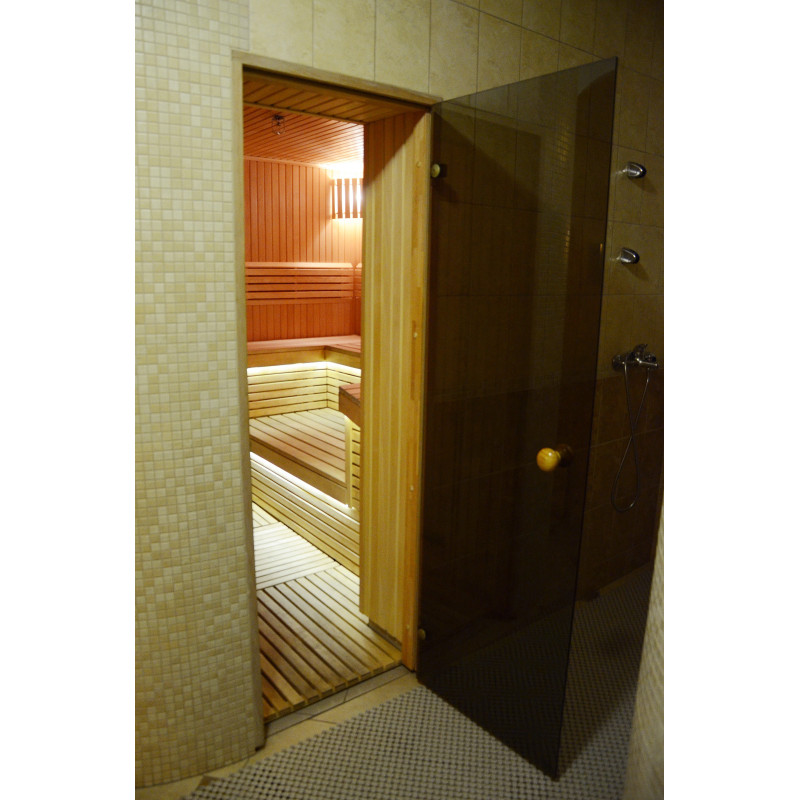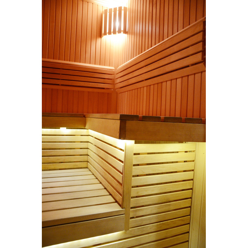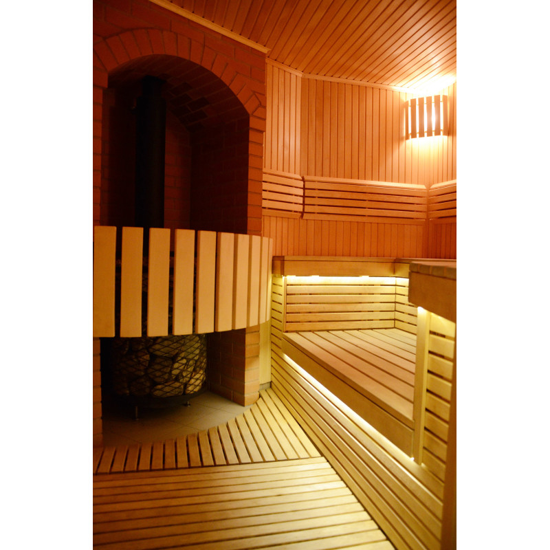 Pirts sienas un soli ir izgatavoti no augstākās kvalitātes liepas koka paneļiem, kas izceļas ar košu, skaistu krāsu un izstaro patīkamu dabisku aromātu. No koka ir izgatavoti arī gaismekļu pārsegi, atzveltnes un oriģināls aizsargžogs ap sildītāju.