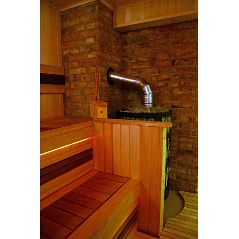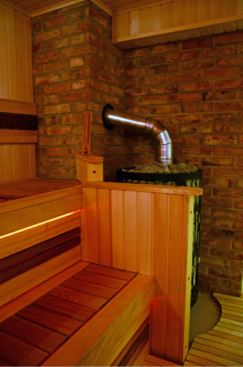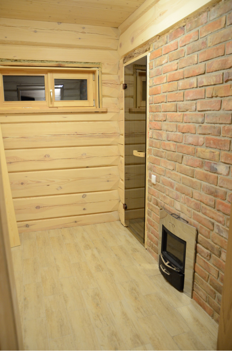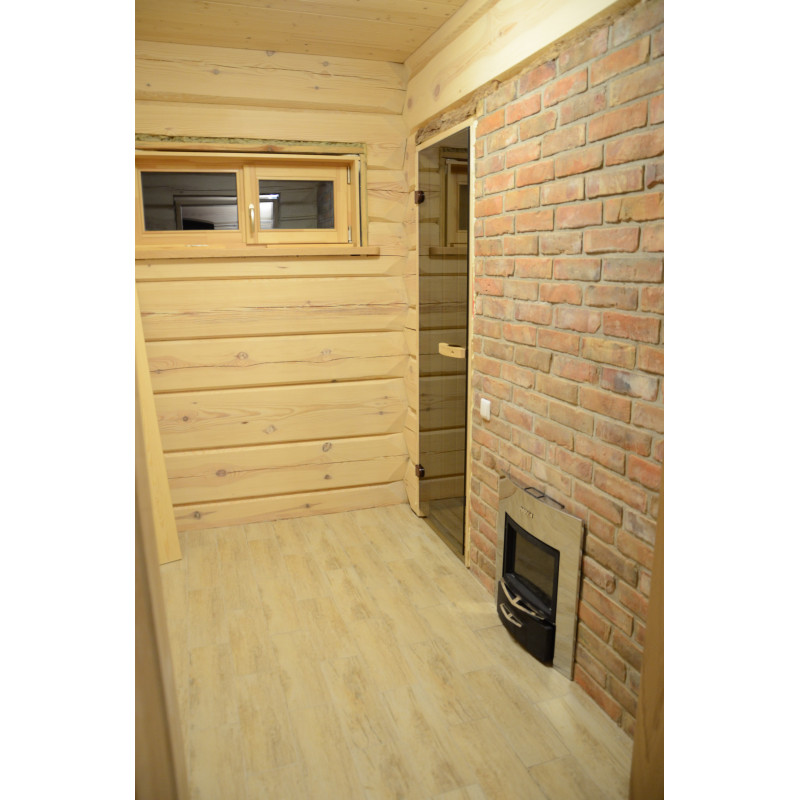 Aprīkojums - Harvia Legend 300 Duo malkas sildītājs. Sildītāja melnais tērauda rāmis satur lielu daudzumu akmeņu, kas ļauj baudīt to izstaroto siltumu pat tad, ja nav augstas temperatūras. Siltums nepazudīs arī pēc uguns dzēšanas. Pateicoties modernajai grila struktūrai, Legend sildītājos malka deg efektīvāk. Samazināta drošības attāluma prasība uzliesmojošiem materiāliem salīdzinājumā ar parastajiem sildītājiem atvieglo pirts telpas plānošanu.