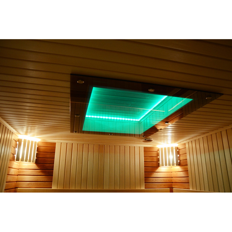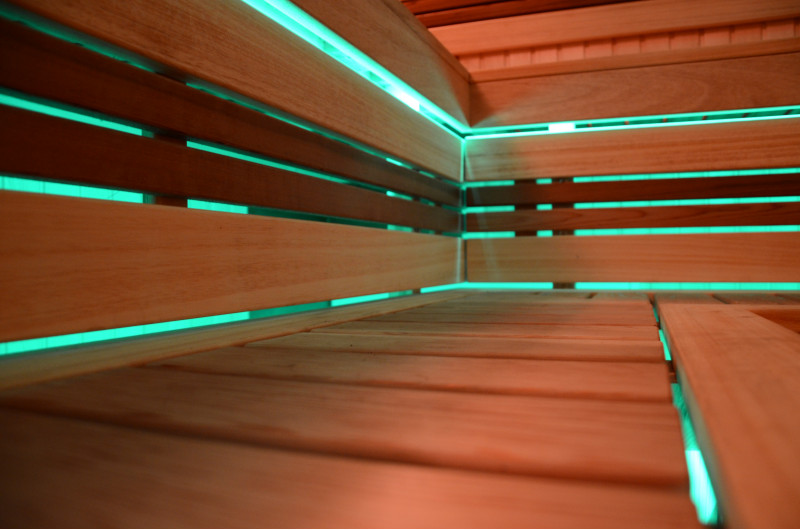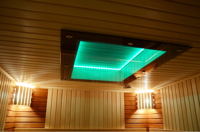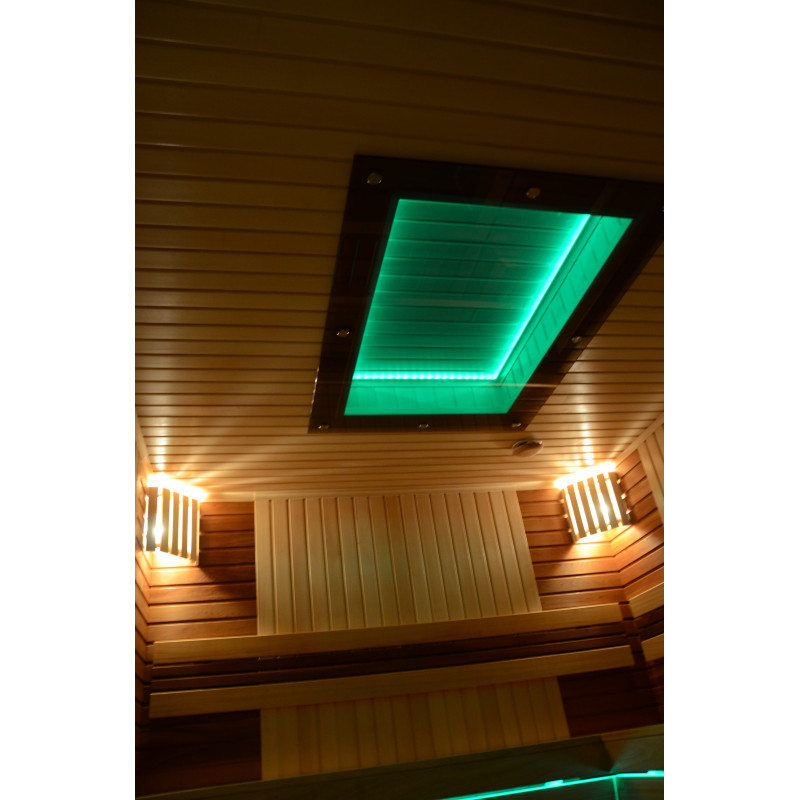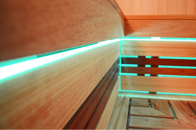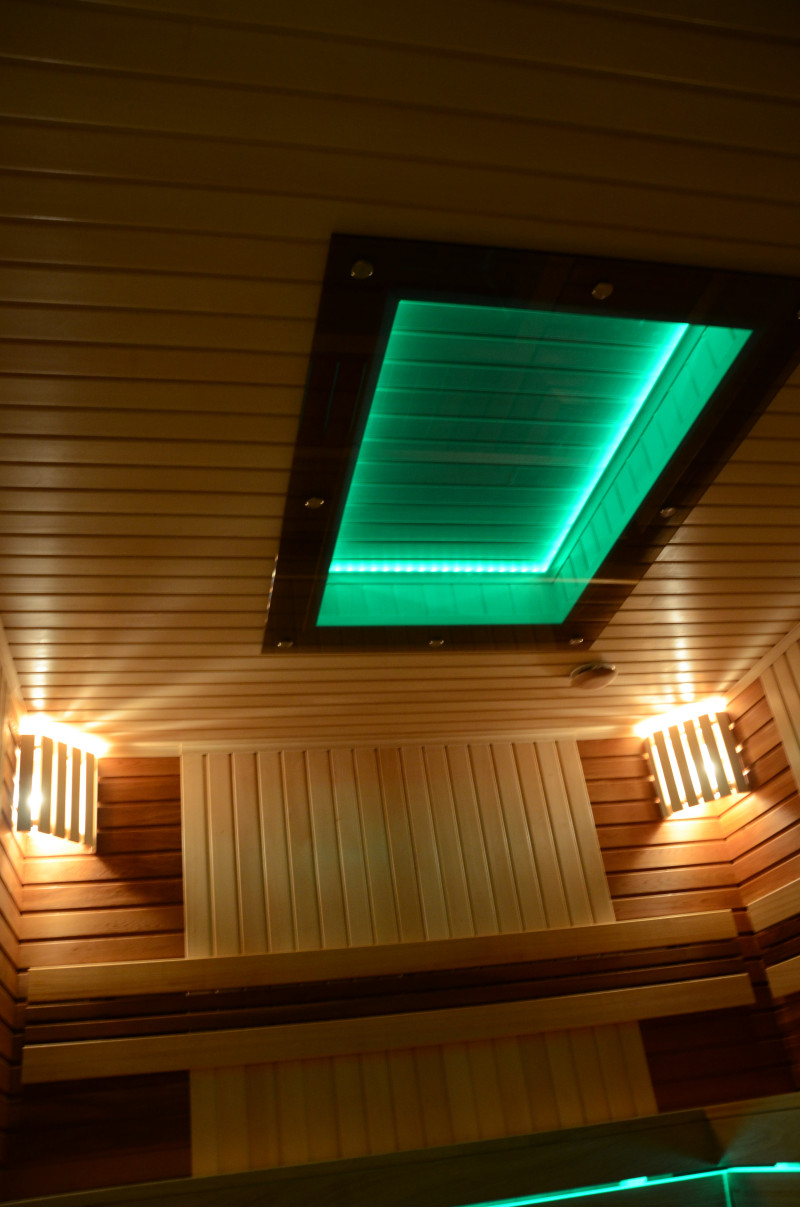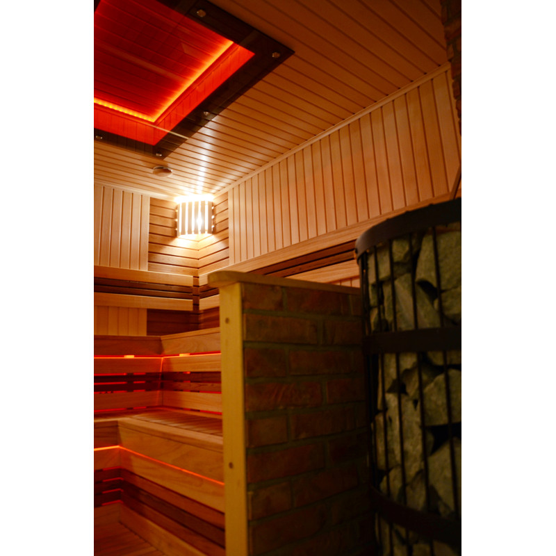 Pie griestiem un zem soliem - LED RGB krāsu apgaismojums, kura krāsas var mainīt, lai radītu pareizo atmosfēru un noskaņu. Sienas apgaismojums - LED baltas siltās krāsas lampas ar koka vāciņiem. Pārvalki palīdz aptumšot gaismu, piešķir pirtī vairāk mājīguma. Tas arī aizsargā gaismekļus no ūdens, tvaika un karstuma.