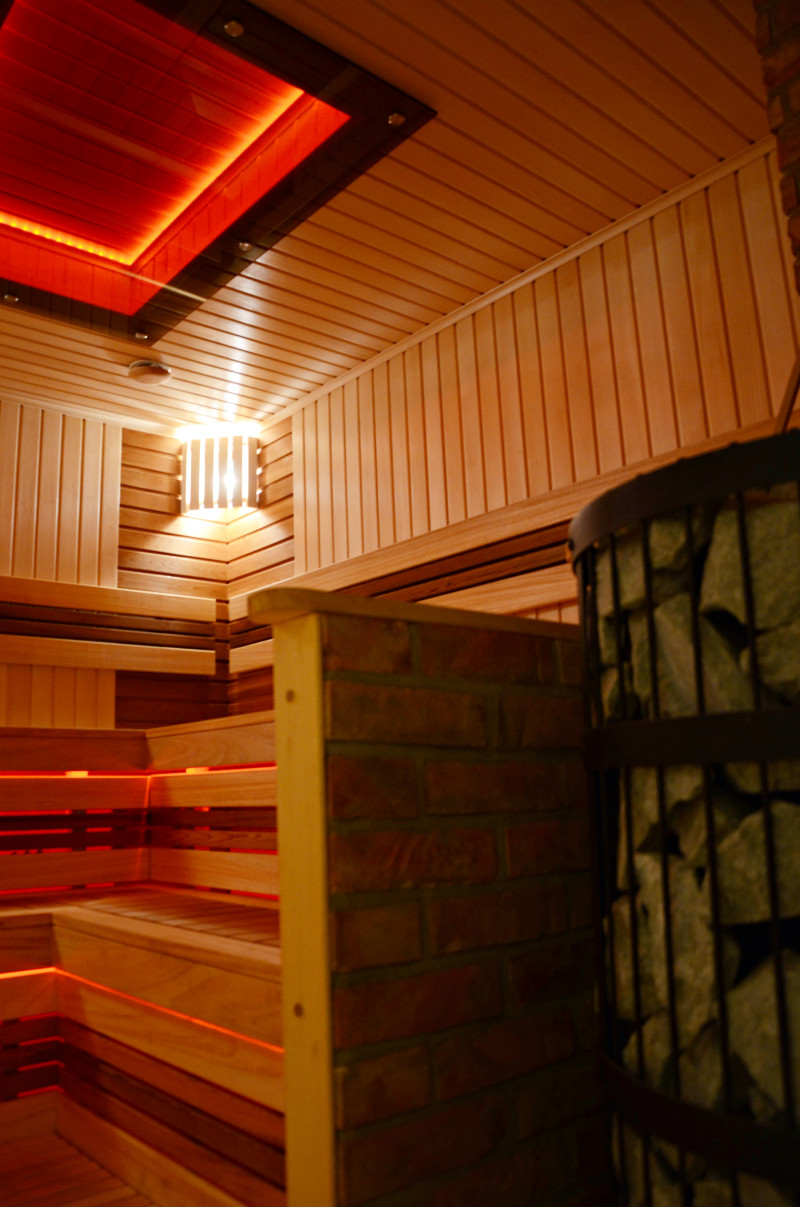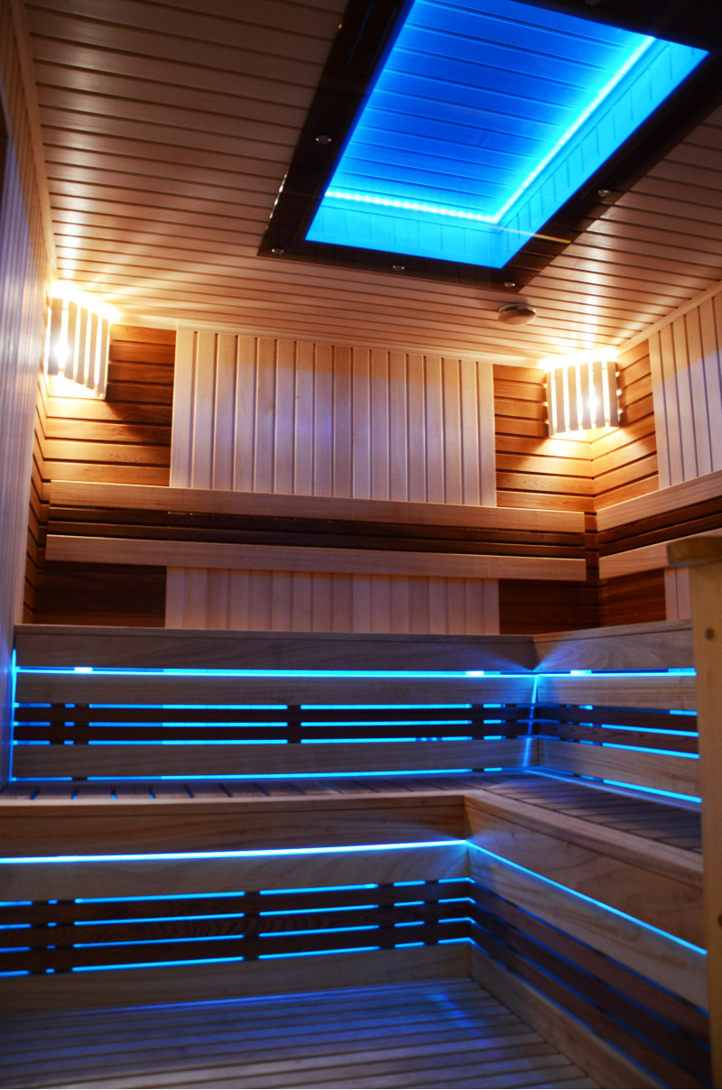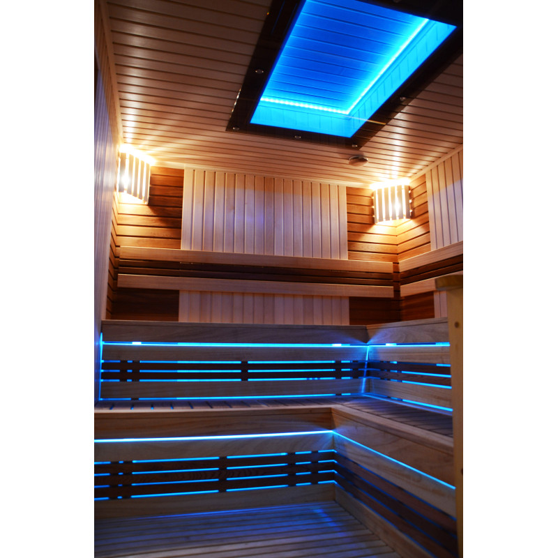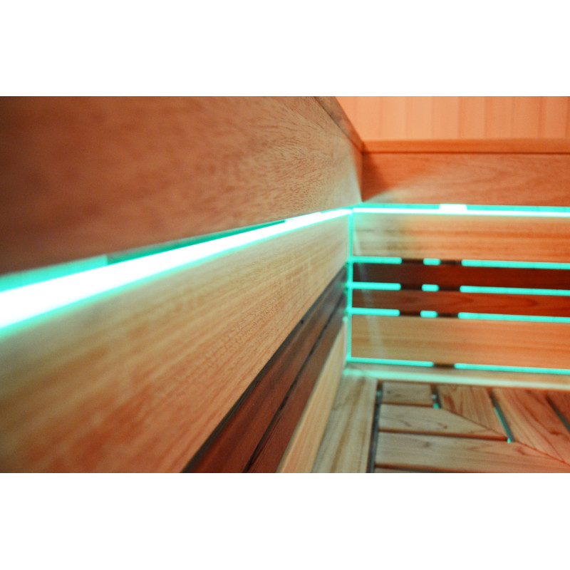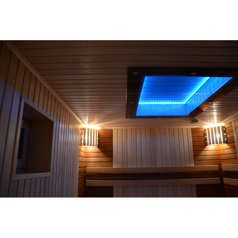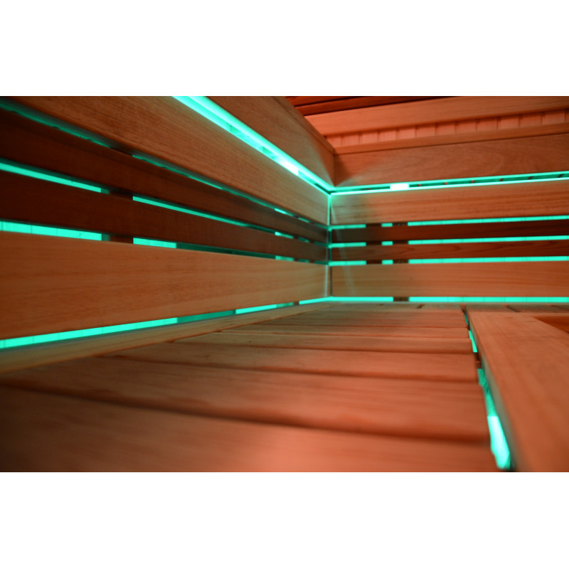 Pie griestiem un zem soliem - LED RGB krāsu apgaismojums, kura krāsas var mainīt, lai radītu pareizo atmosfēru un noskaņu. Sienas apgaismojums - LED baltas siltās krāsas lampas ar koka vāciņiem. Pārvalki palīdz aptumšot gaismu, piešķir pirtī vairāk mājīguma. Tas arī aizsargā gaismekļus no ūdens, tvaika un karstuma.