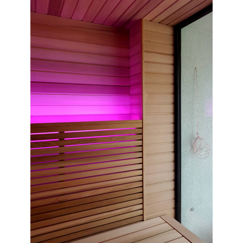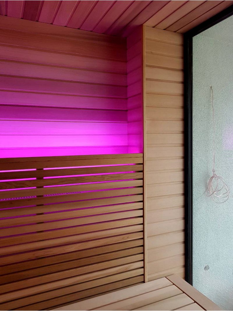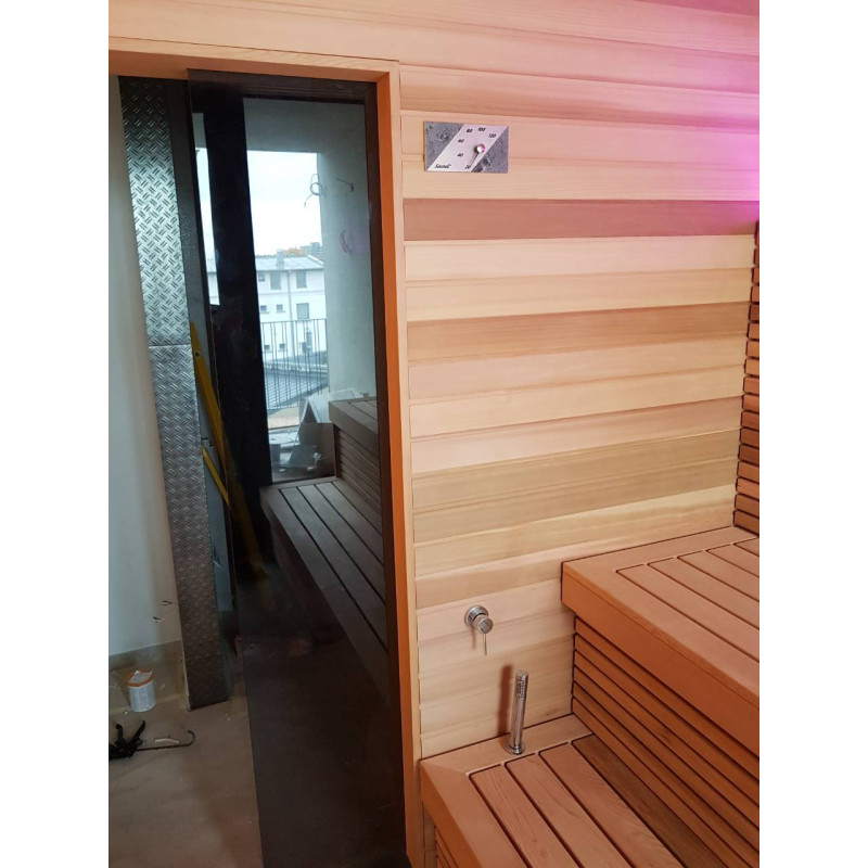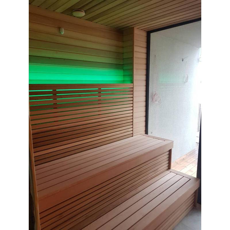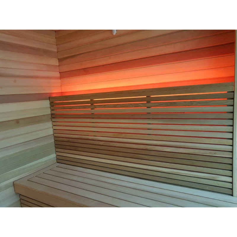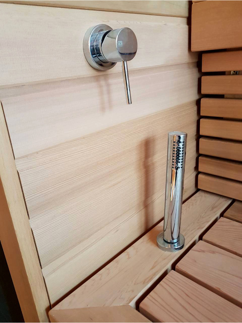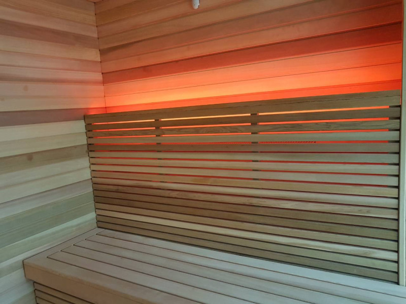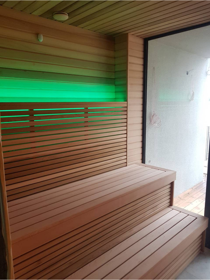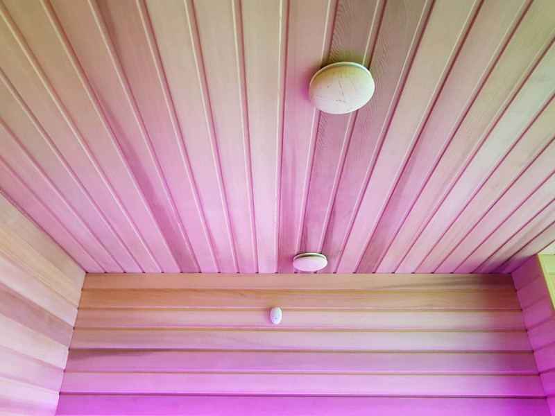 Pirts interjera koka detaļas ir izgatavotas no ciedra koka. Šis koks ir ārkārtīgi izturīgs, nodilumizturīgs un nedeformējas. Augstā temperatūrā ciedra apšuvums neizdala sveķus. Tas ļoti labi atstaro siltumu, kas ir būtiski saunās un vannās. Ciedru koks izdala ēteriskās eļļas un rada dabiskās aromterapijas efektu.