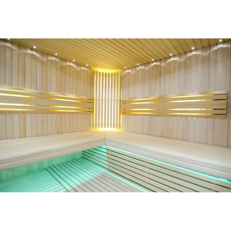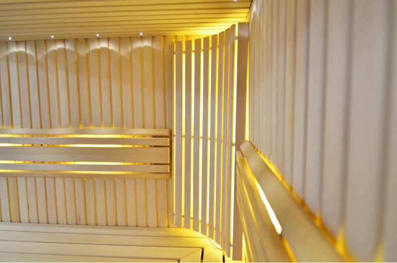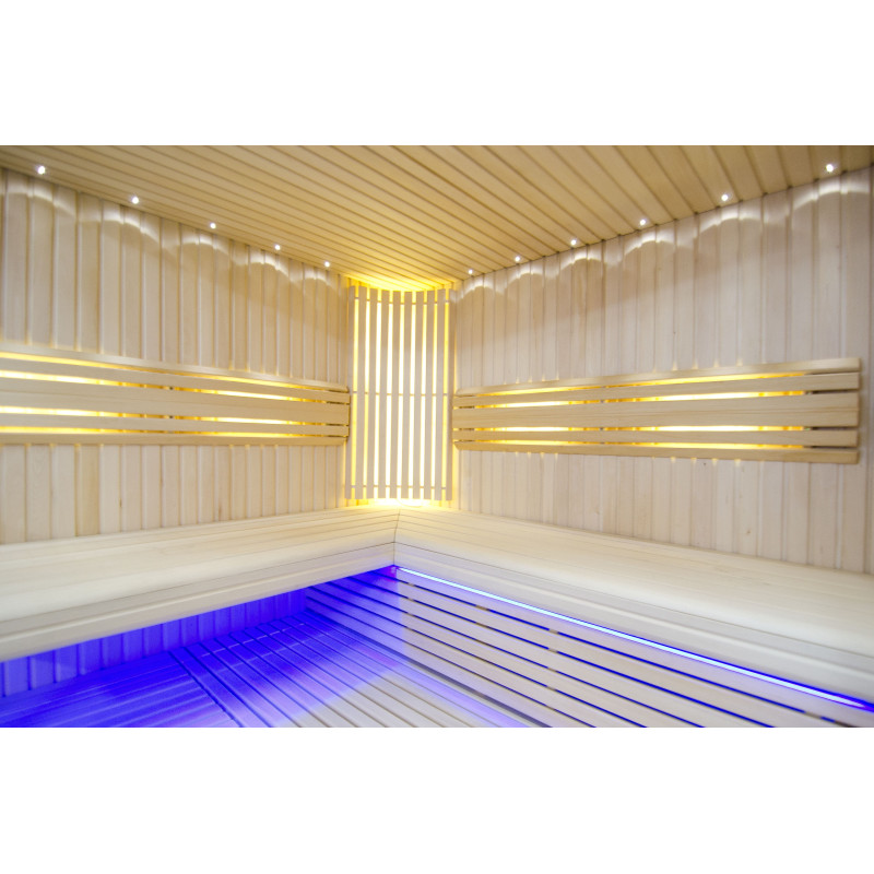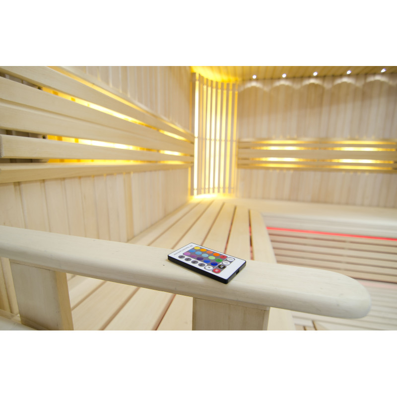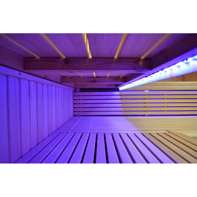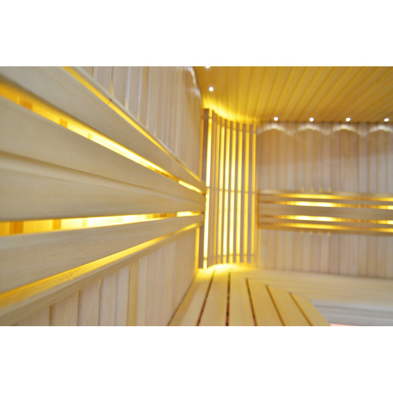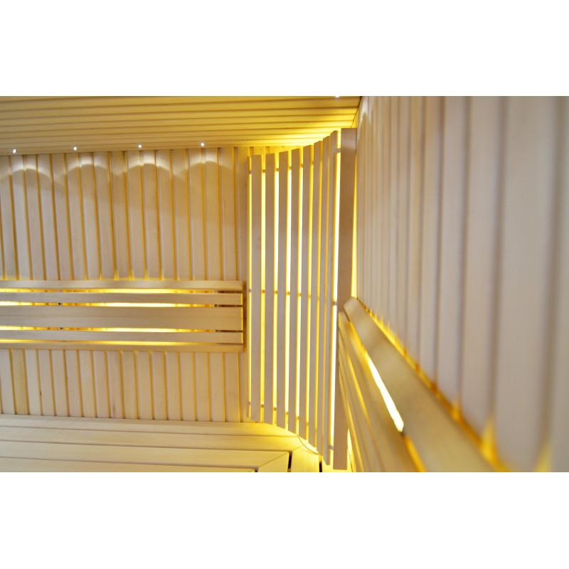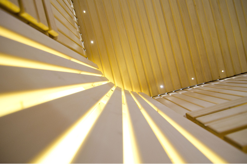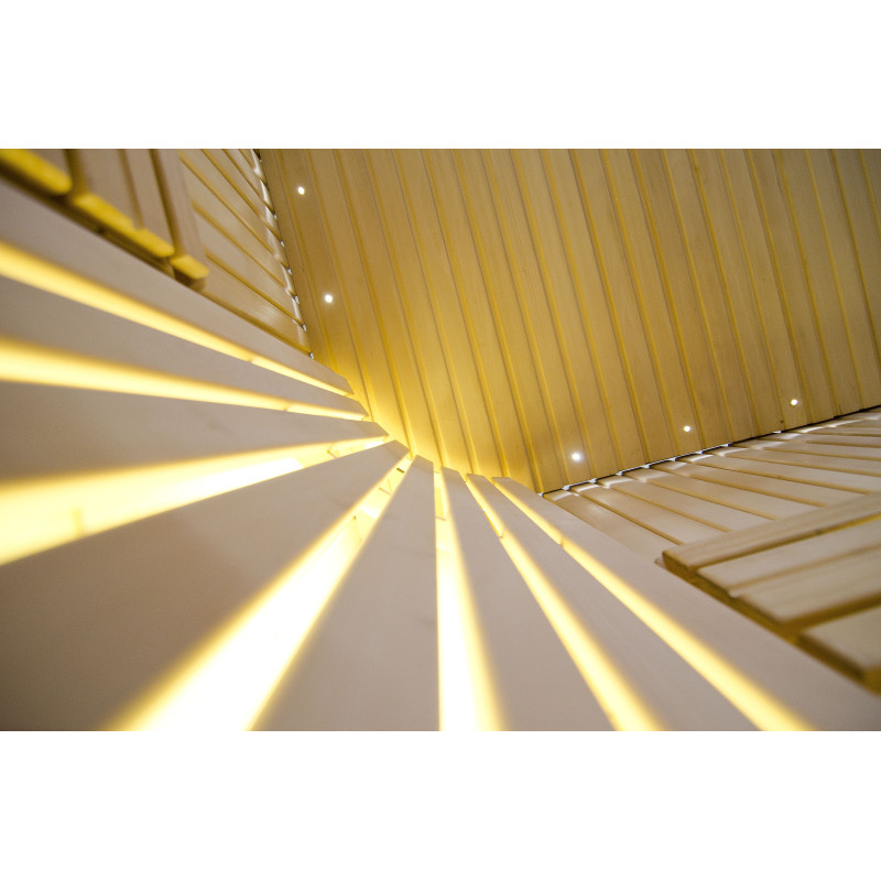 Griesti ir izgaismoti ar baltu LED apgaismojumu "mēness" - laba alternatīva optiskās šķiedras apgaismojumam. Uz sienām zem atzveltnēm - LED balts siltais apgaismojums, kas lieliski akcentē koka faktūru. Zem soliem - LED RGB krāsu apgaismojums, kura krāsas var ērti vadīt ar pulti, lai radītu vēlamo pirts atmosfēru.