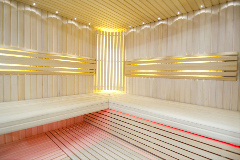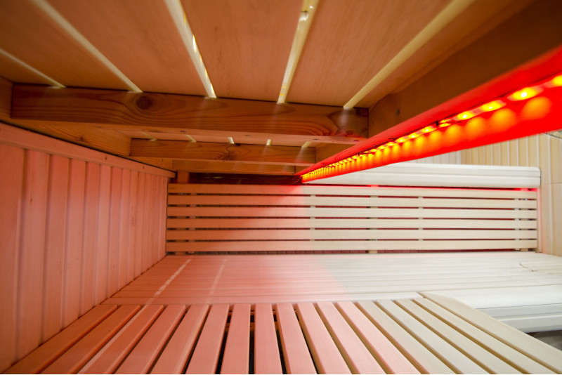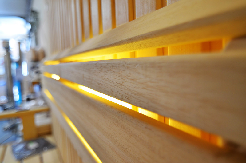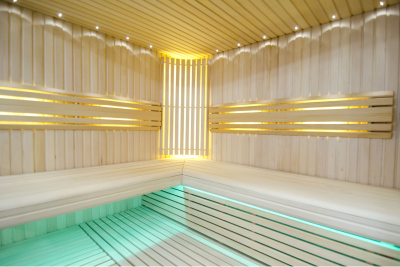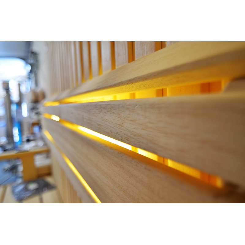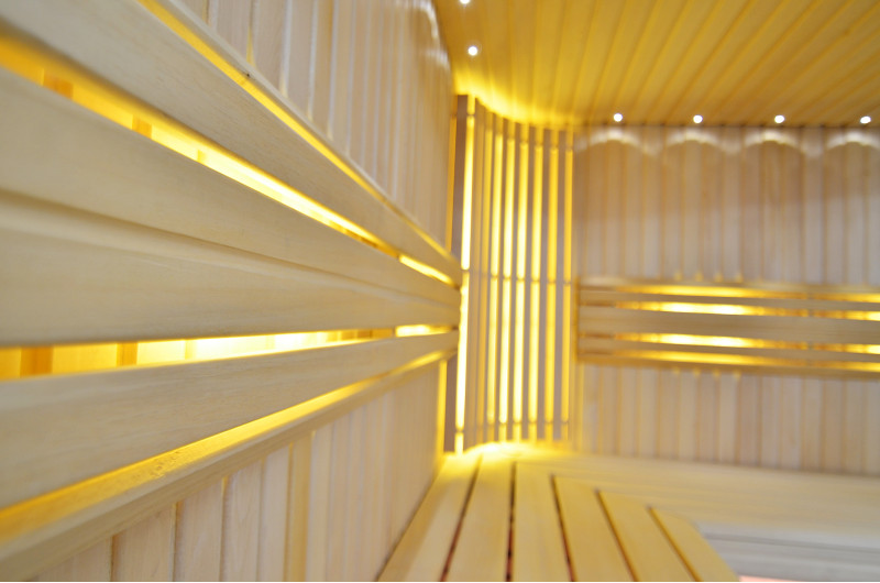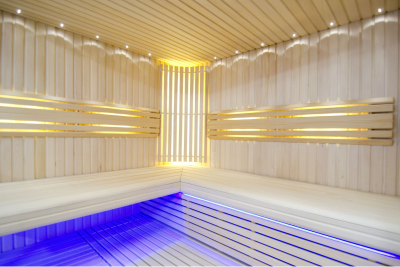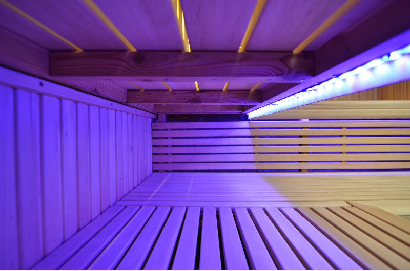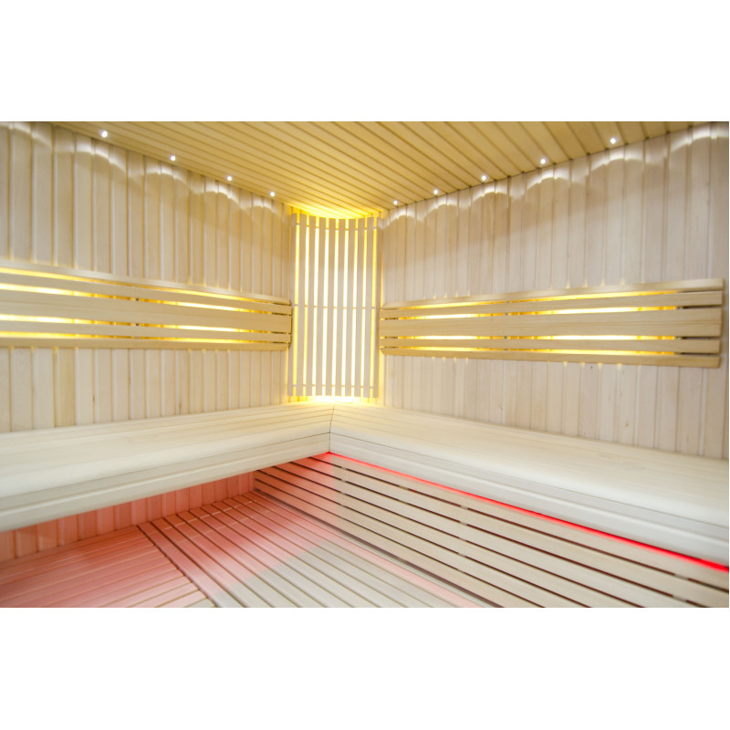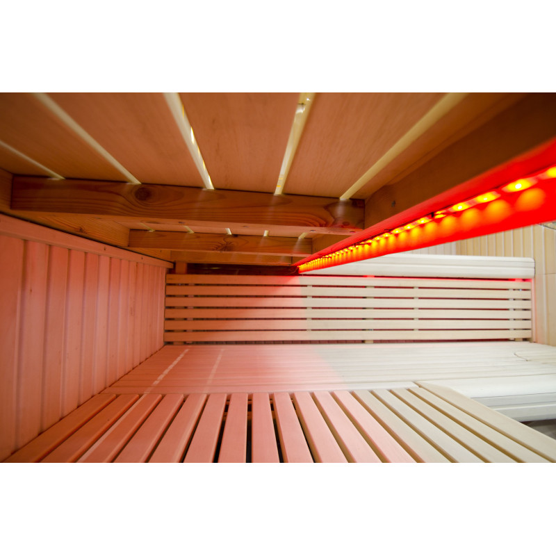 Griesti ir izgaismoti ar baltu LED apgaismojumu "mēness" - laba alternatīva optiskās šķiedras apgaismojumam. Uz sienām zem atzveltnēm - LED balts siltais apgaismojums, kas lieliski akcentē koka faktūru. Zem soliem - LED RGB krāsu apgaismojums, kura krāsas var ērti vadīt ar pulti, lai radītu vēlamo pirts atmosfēru.