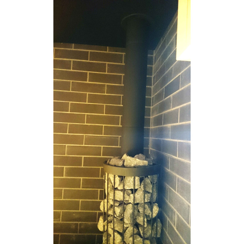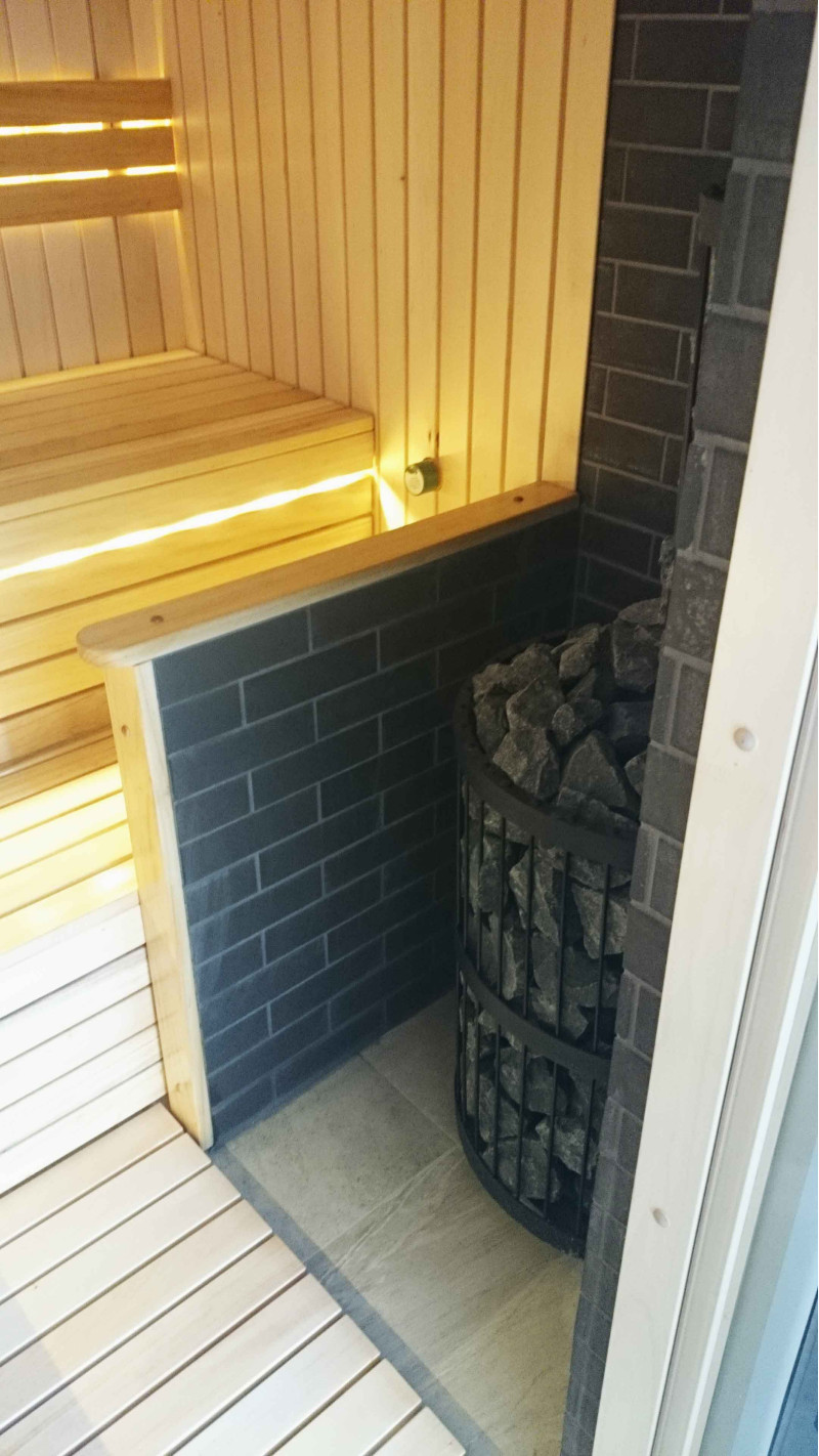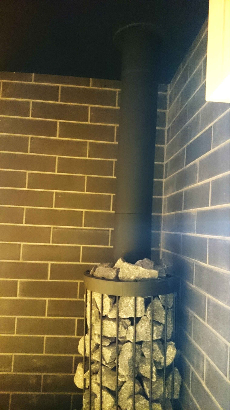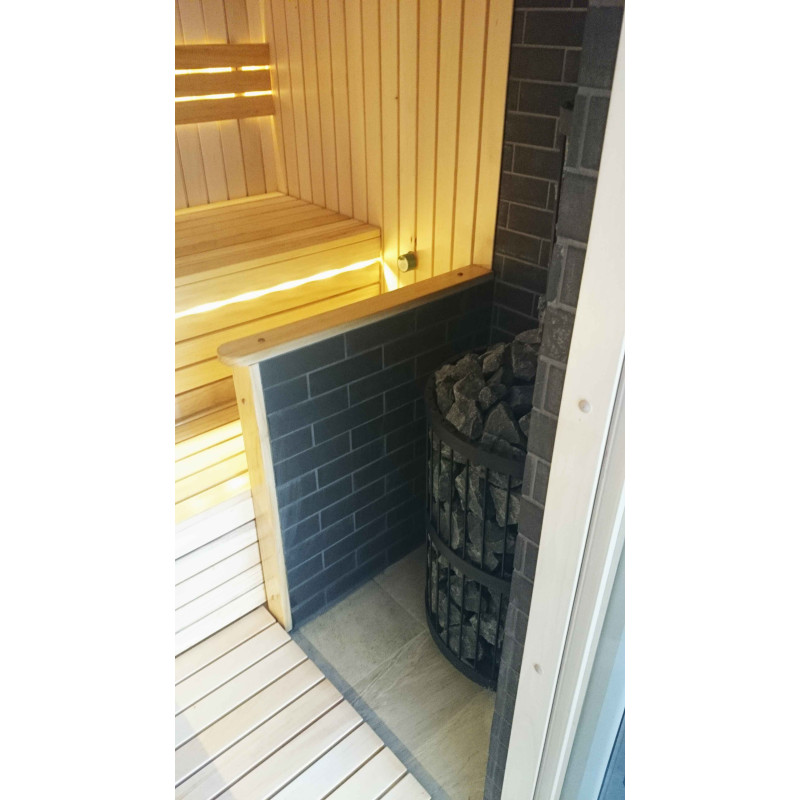 Šis pirts projekts ar aizsargsienu sildītājam. Siena izgatavota no Minerit karstumizturīgas plāksnes, uz metāla rāmja.