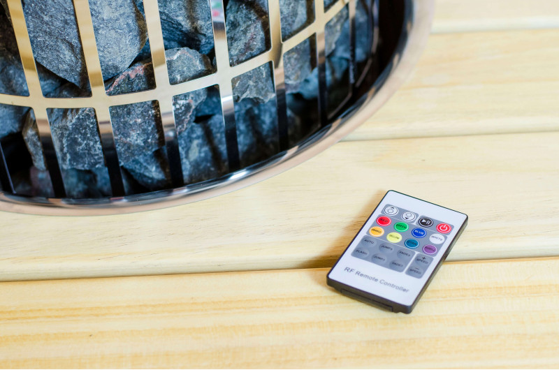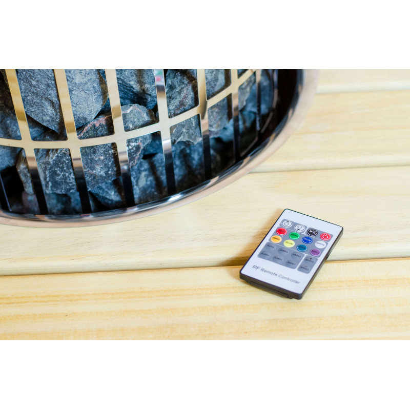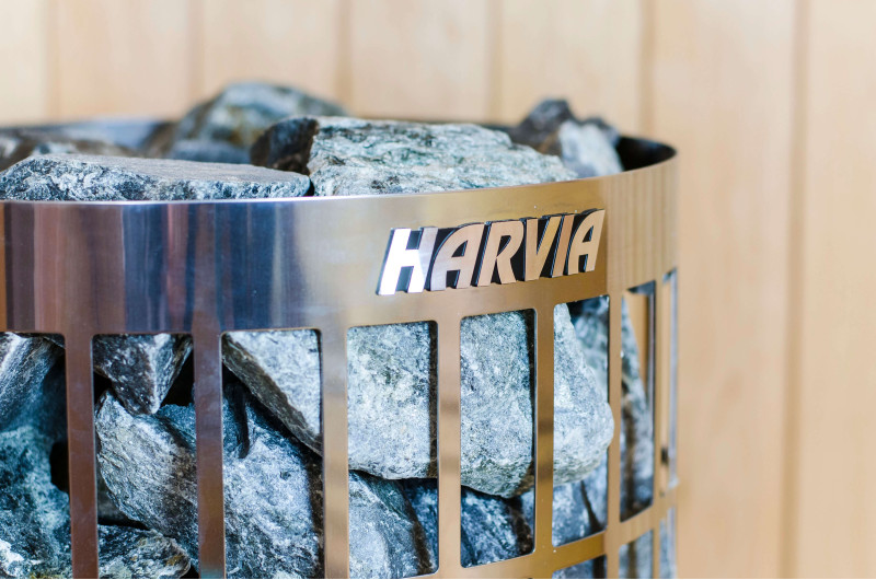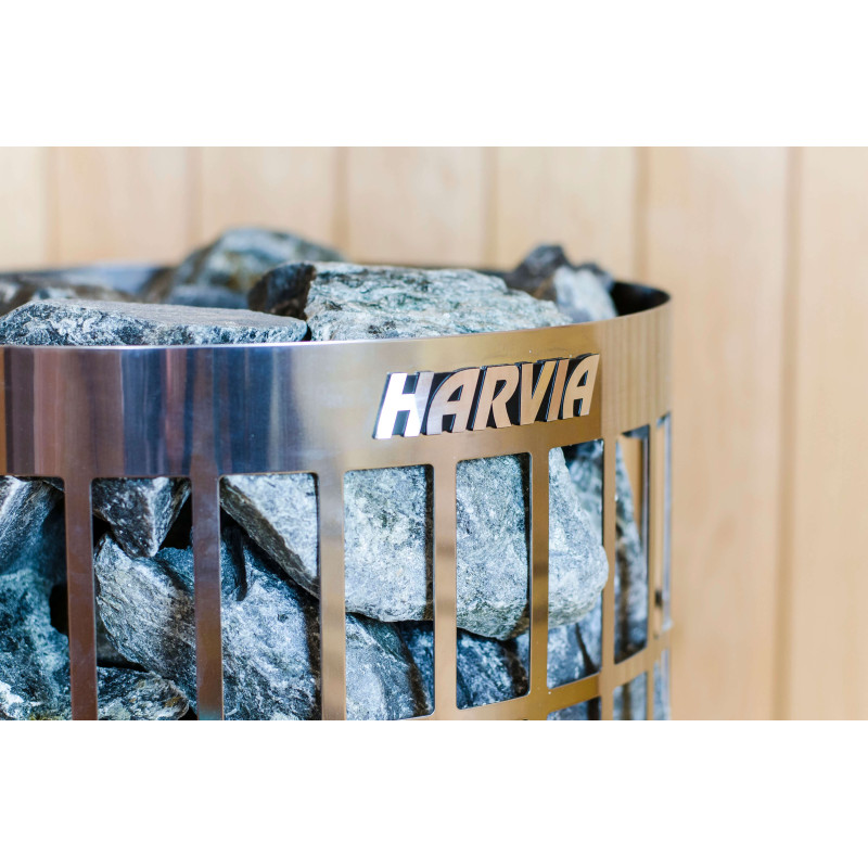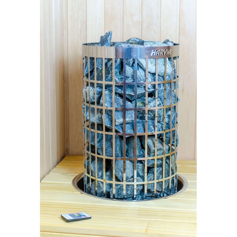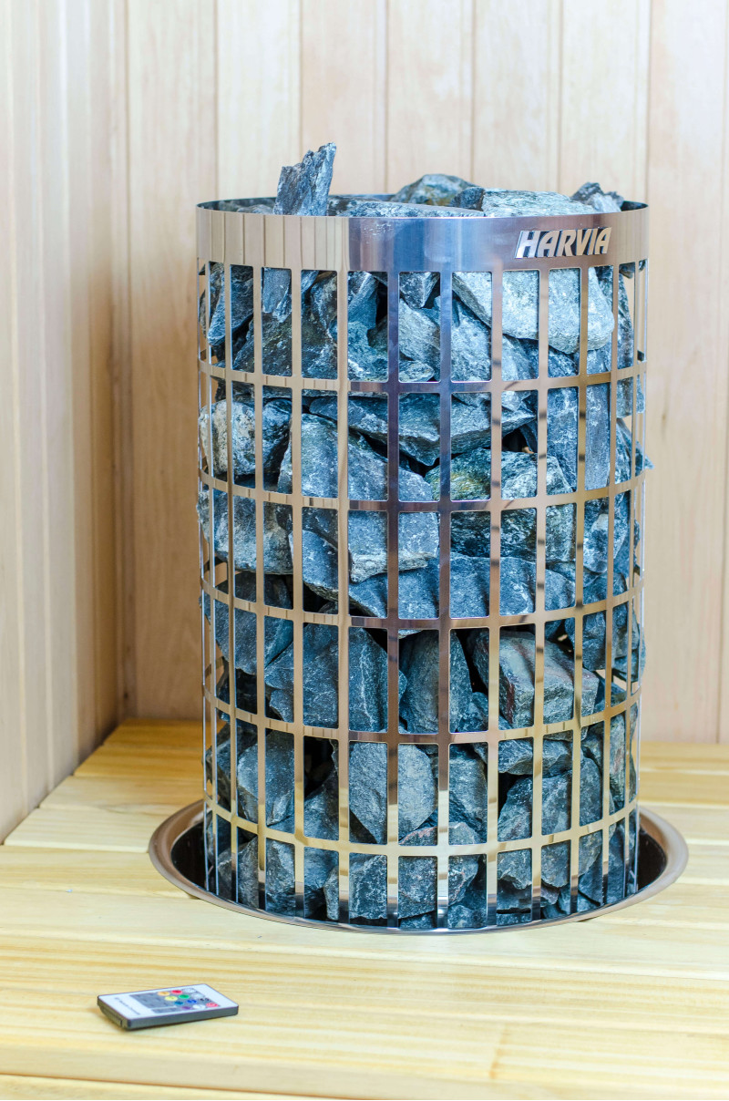 Sildītājs - Harvia Cilindro ar apdares gredzenu un pildīts ar gabbro diabase akmeņiem. Durvis - rūdīts bronzas stikls ar melnalkšņa rāmi.