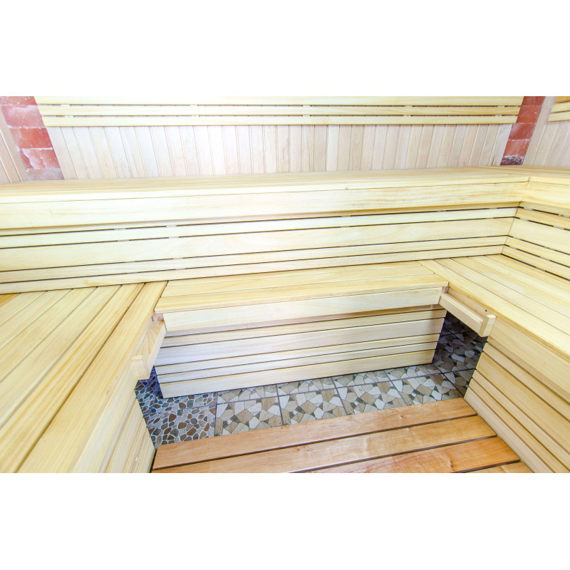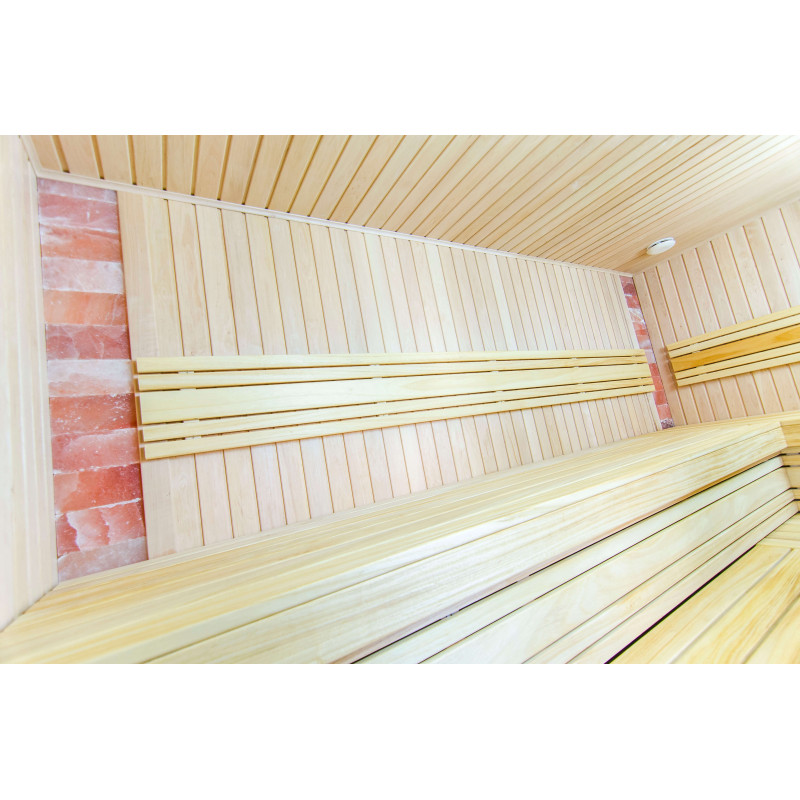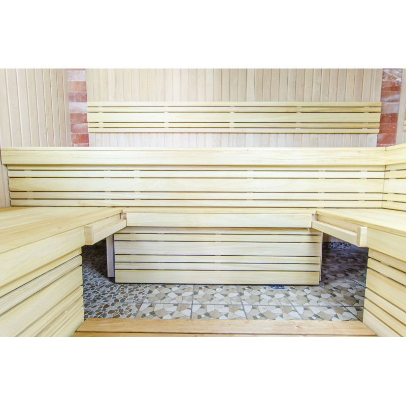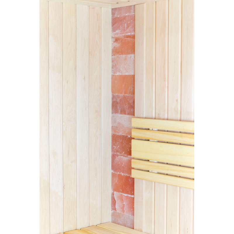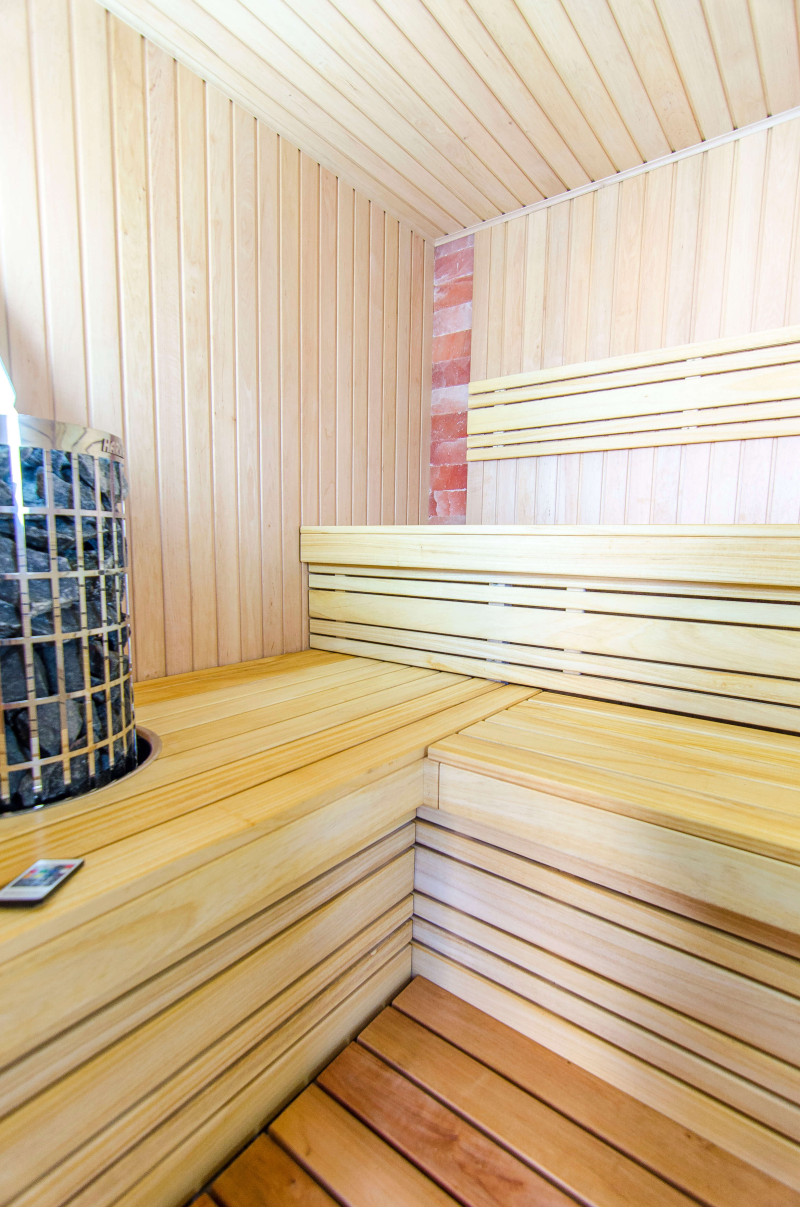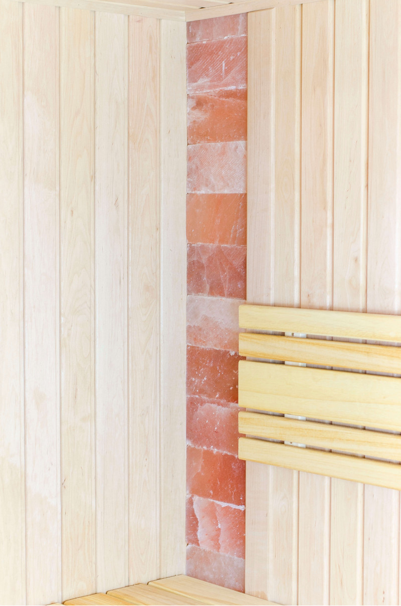 Soliņi, atzveltnes, griesti, sienas - no Āfrikas nesildošas augstas klases abači koka, grīdas restes - no melnalkšņa koka. Atzveltnēs un aiz Himalaju sāls ķieģeļiem ir iebūvēts krāsu RGB apgaismojums, ko kontrolē bezvadu krāsu maiņas konsole, kas akcentē Himalaju sāls raksturīgo izskatu.