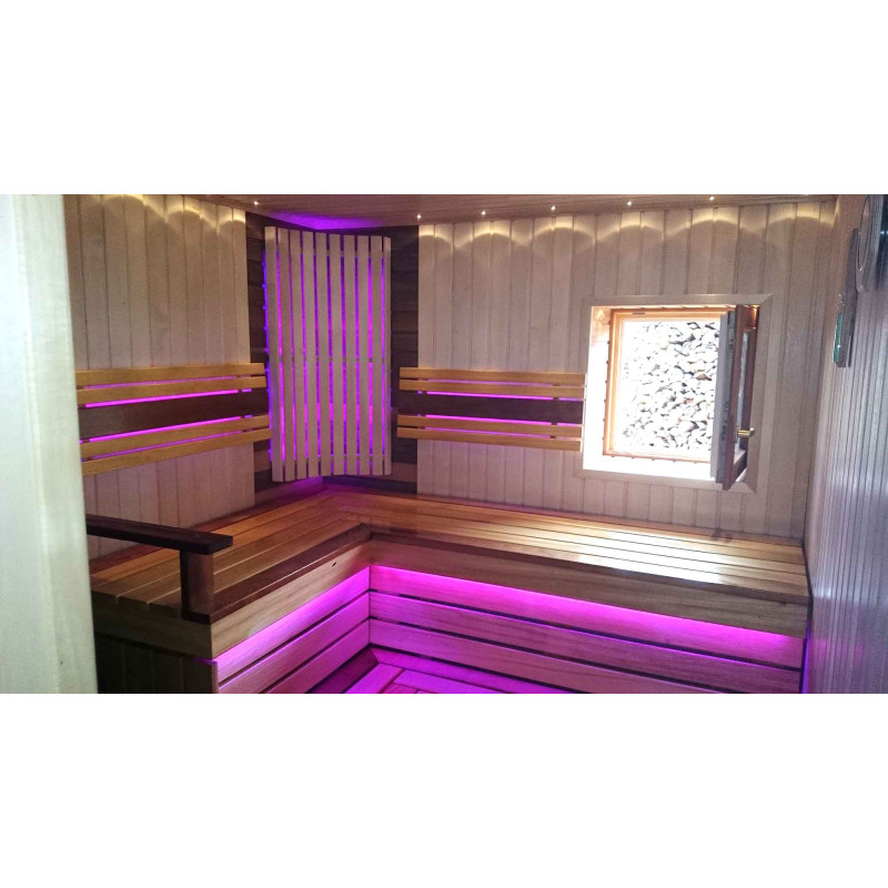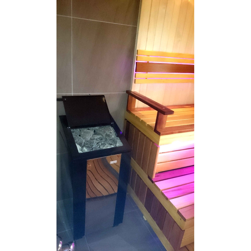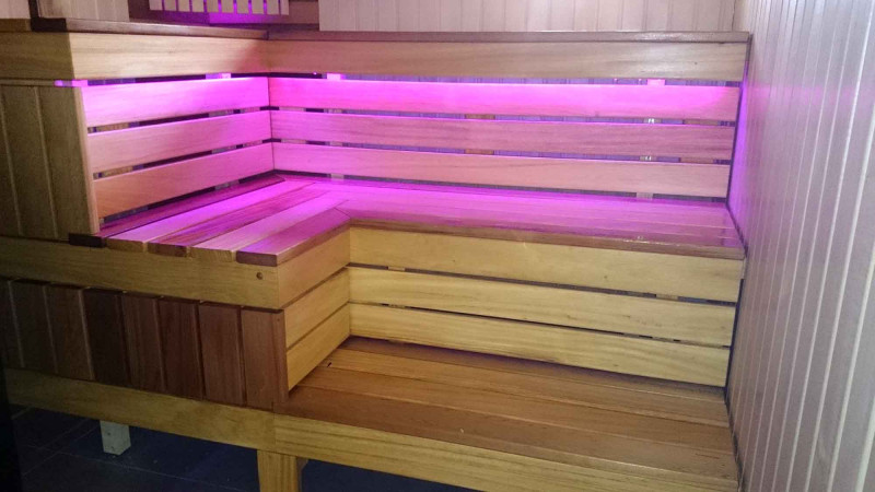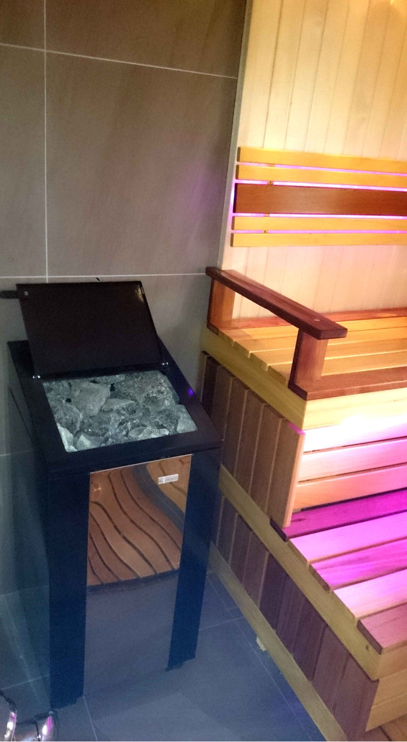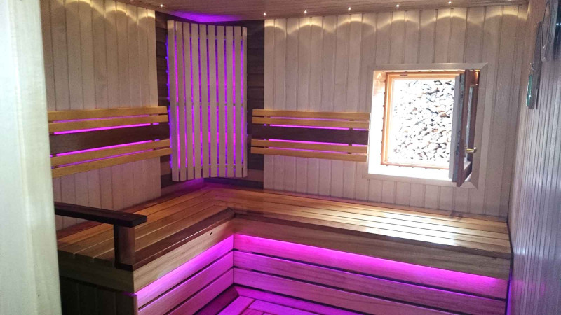 Pirts ir aprīkota ar ventilācijas sistēmu. Krāsains apgaismojums ir uzstādīts zem soliem un aiz atzveltnēm, radot mājīgu, nomierinošu vidi. Piekaramā lampa Harvia ar abachi koka apvalku. Harvia termometrs un higrometrs, divas skalas.