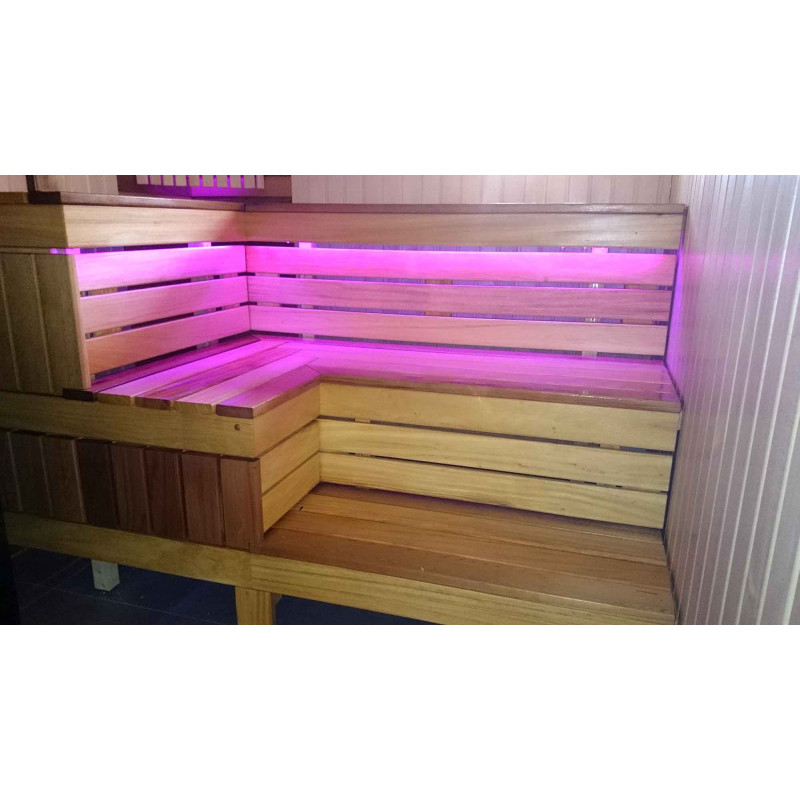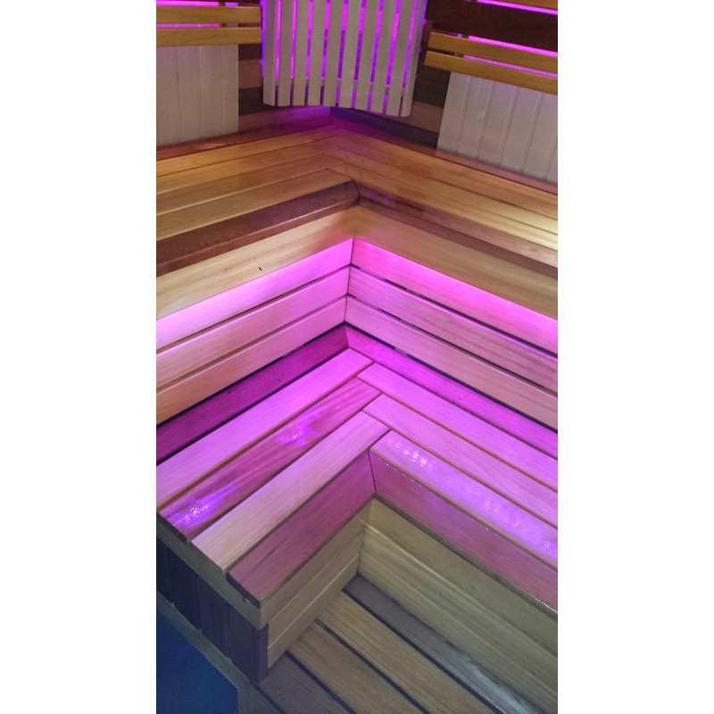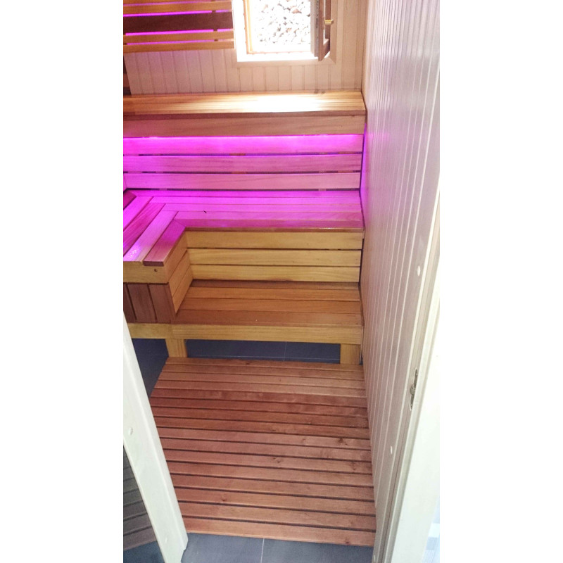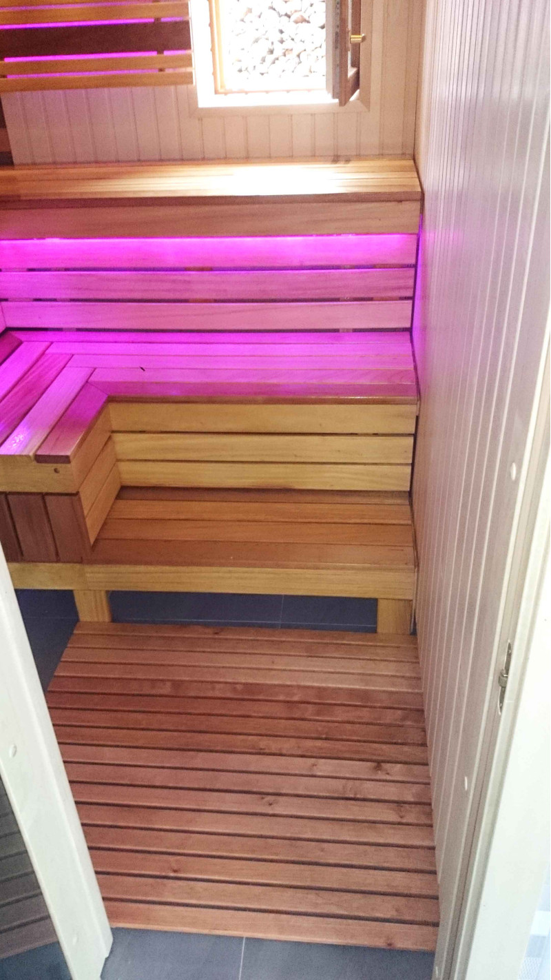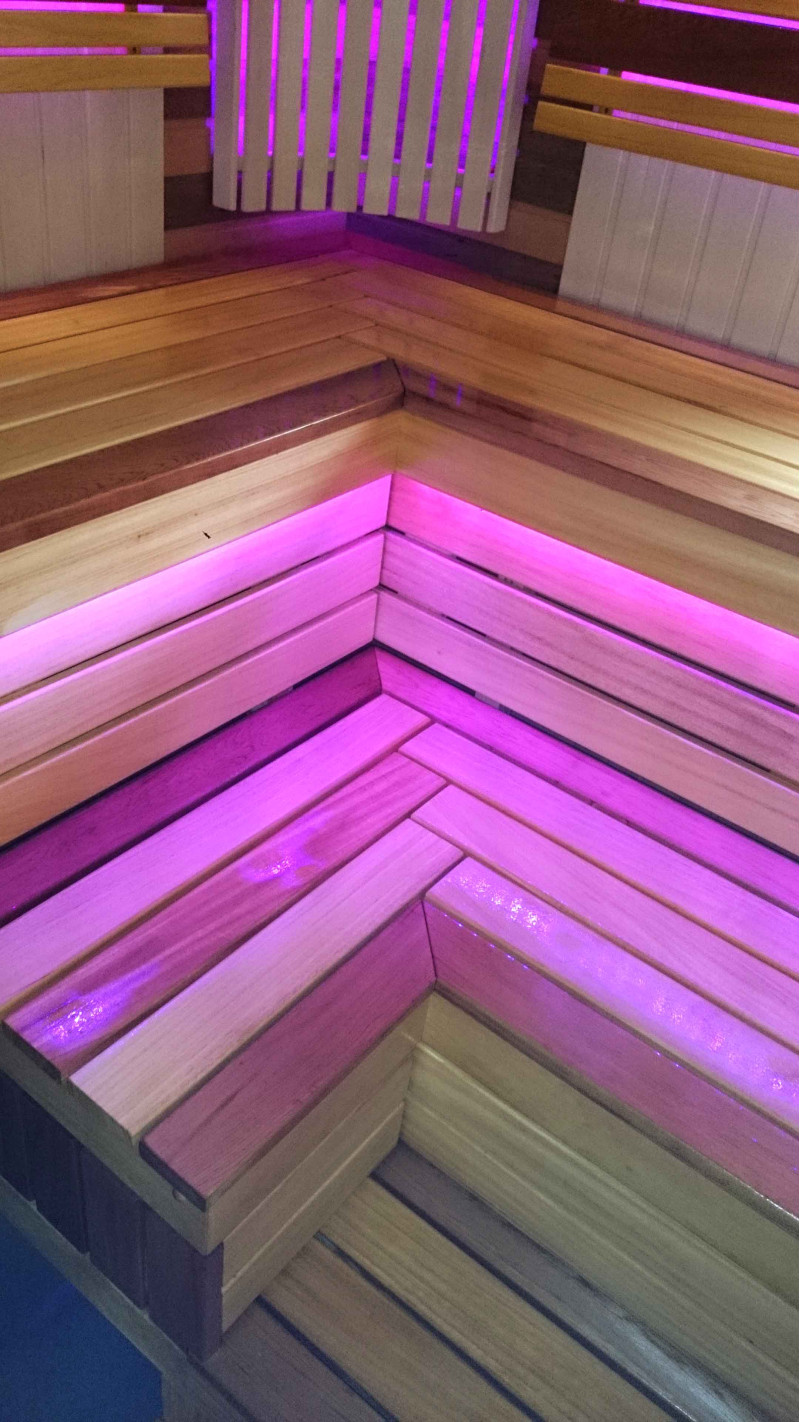 Pirts ir aprīkota ar ventilācijas sistēmu. Krāsains apgaismojums ir uzstādīts zem soliem un aiz atzveltnēm, radot mājīgu, nomierinošu vidi. Piekaramā lampa Harvia ar abachi koka apvalku. Harvia termometrs un higrometrs, divas skalas.