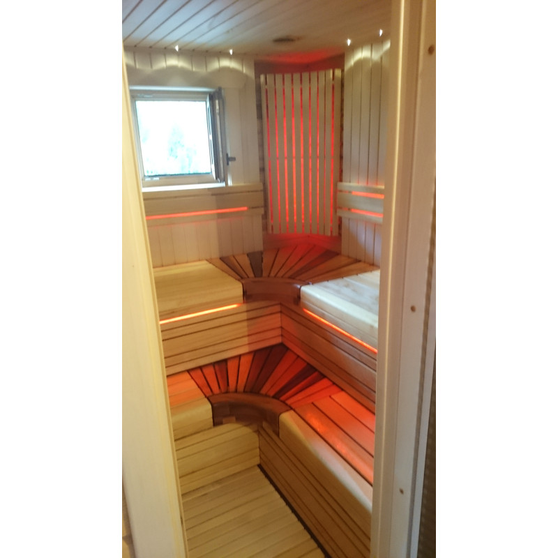Divstāvu lāvu stūros iestrādāta koša pirts interjera detaļa - "Saule". Stūrī - atzveltne-abažūrs no liepas koka. Apgaismojums - LED "Saule" - rada viengabalainu attēlu un atkārto līdzīgas formas, ir izturīgs pret karstumu un mitrumu, palīdz radīt relaksējošu efektu pirtī.