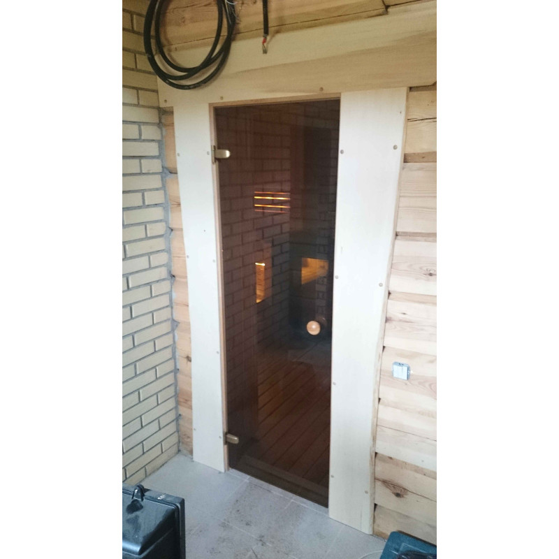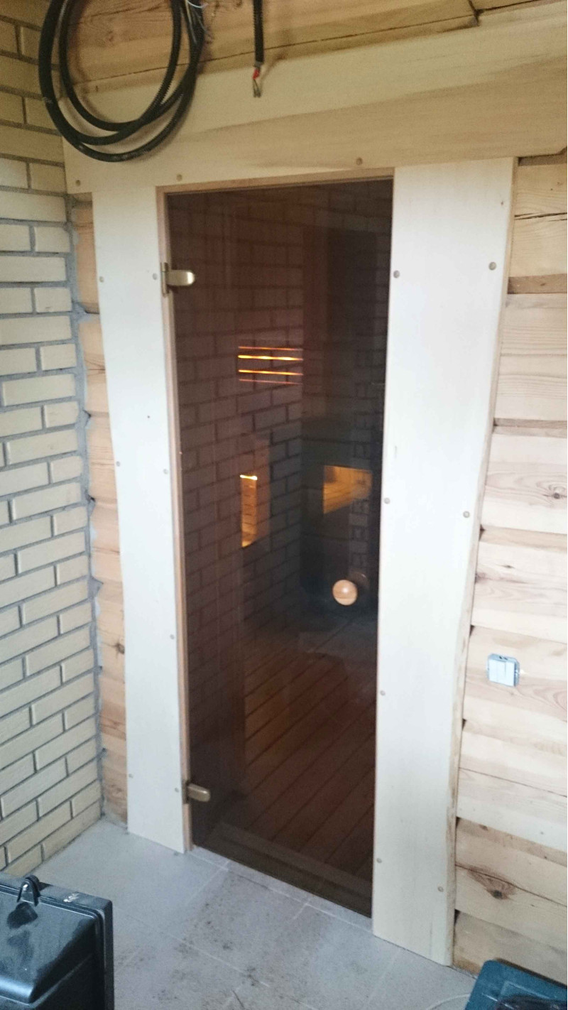 Durvis - tonēts rūdīts stikls ar apaļu koka rokturi.