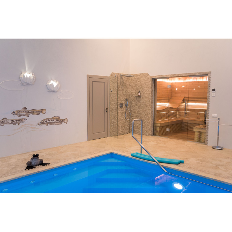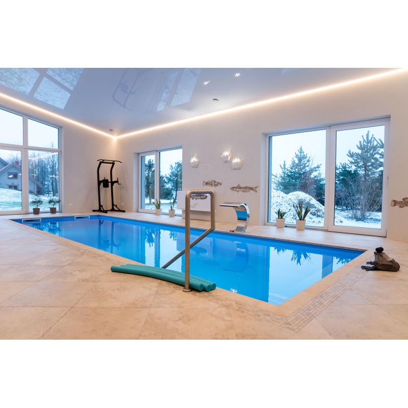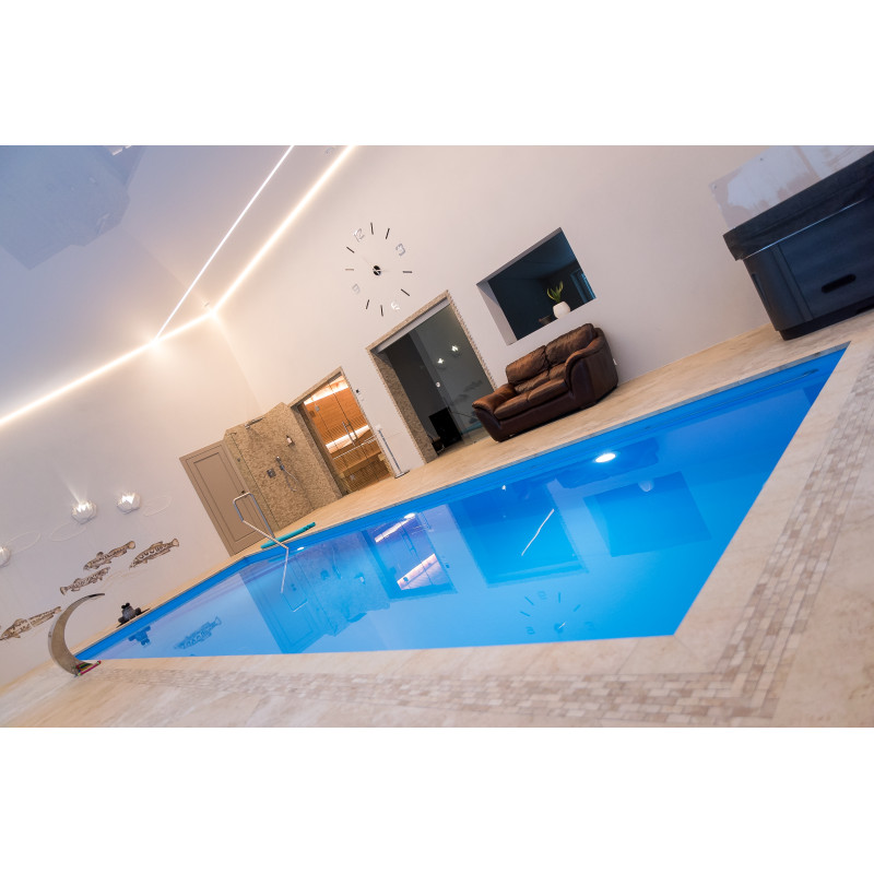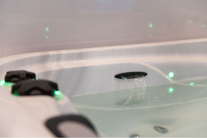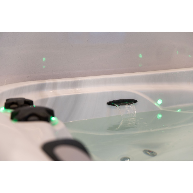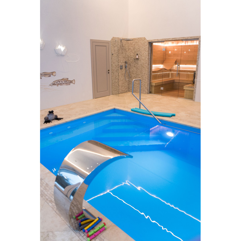 Aprīkots ar peldošo strāvu, ūdens kaskādi, masāžas soliņu, margām, kāpnēm un zemūdens apgaismojumu.