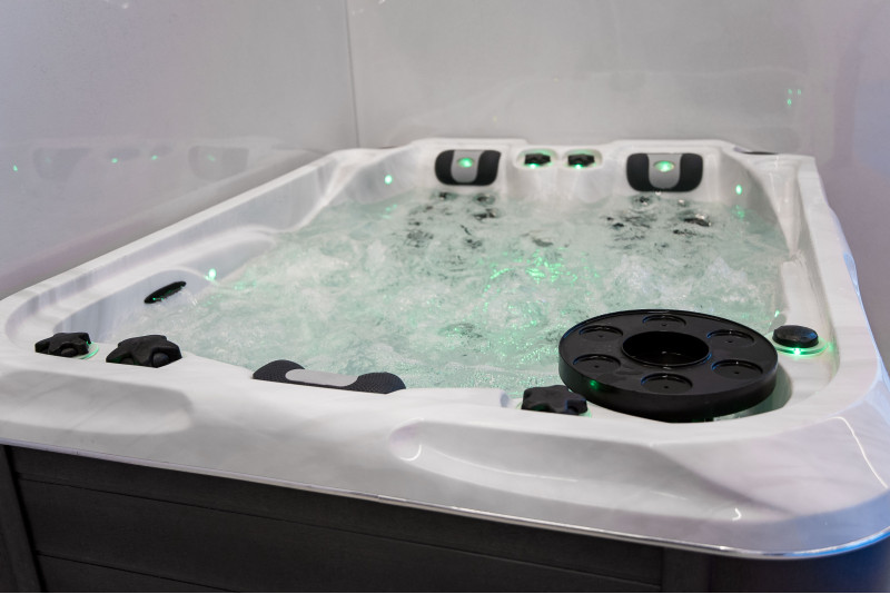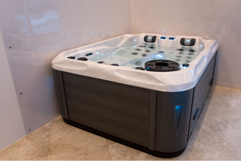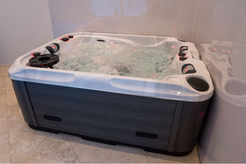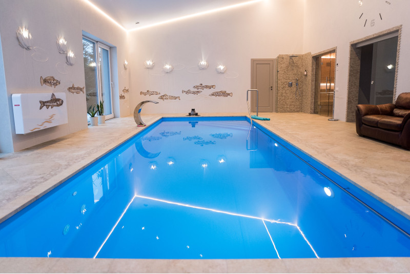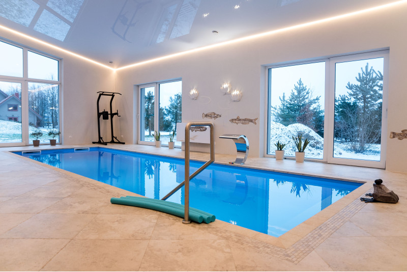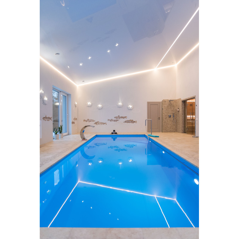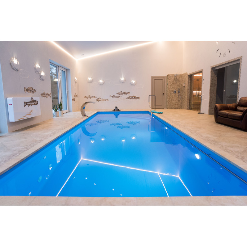 Aprīkots ar peldošo strāvu, ūdens kaskādi, masāžas soliņu, margām, kāpnēm un zemūdens apgaismojumu.