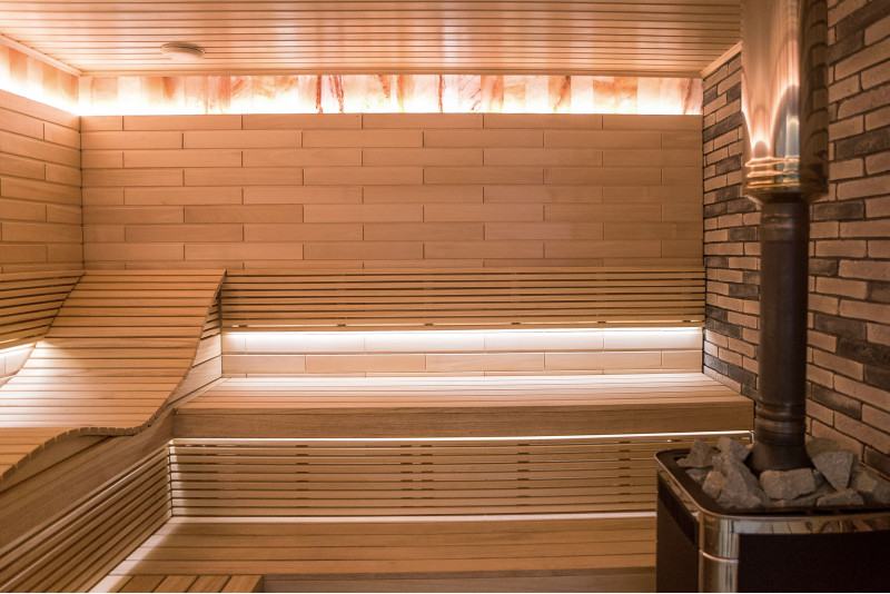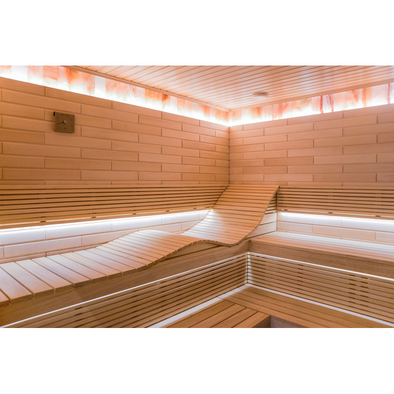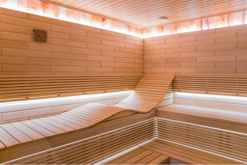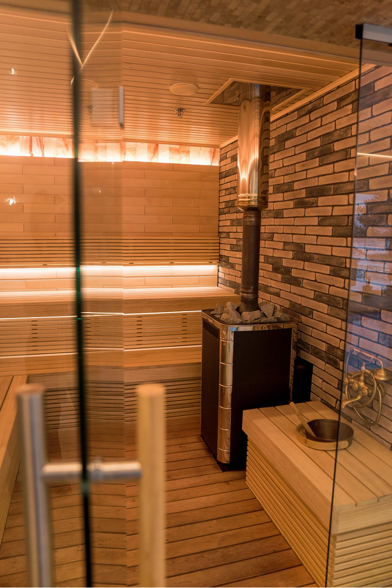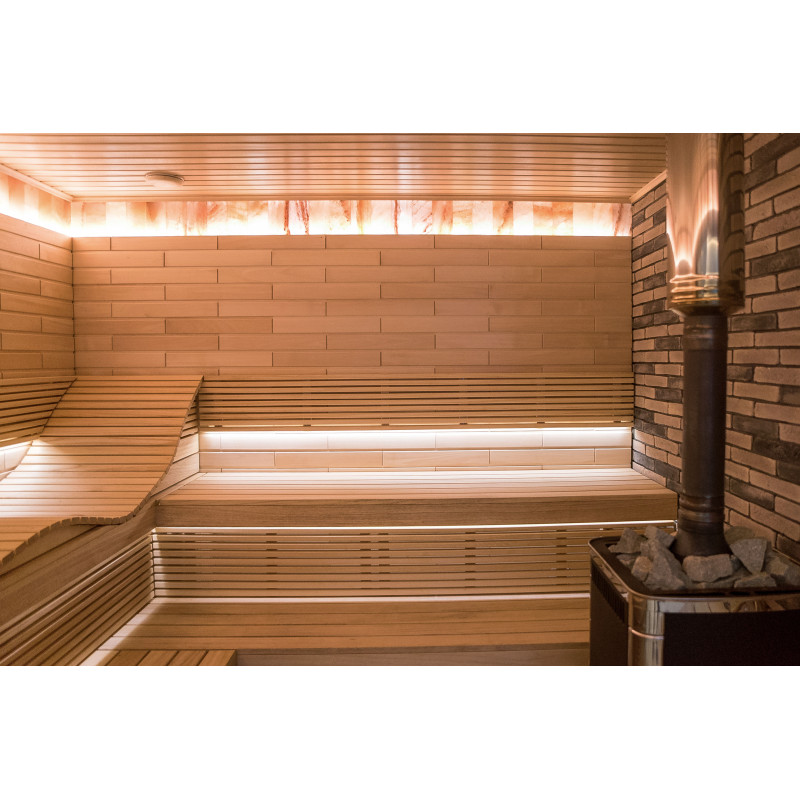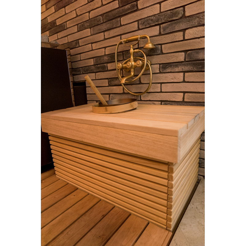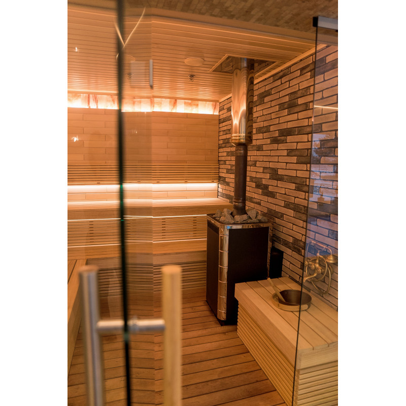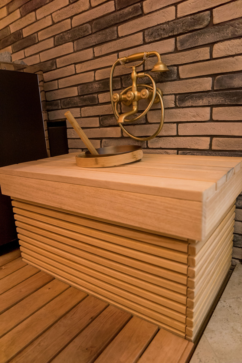 Pirts iekšējā apdare - liepa, gultas dēļi, grīdas restes - abachi koks. Gultas, balsti un sienas ir piesūcinātas ar eļļu un lakotas.