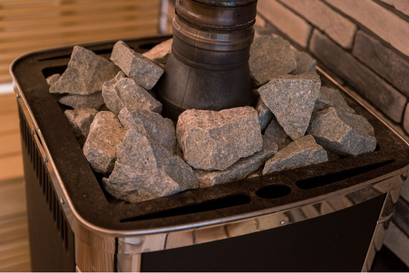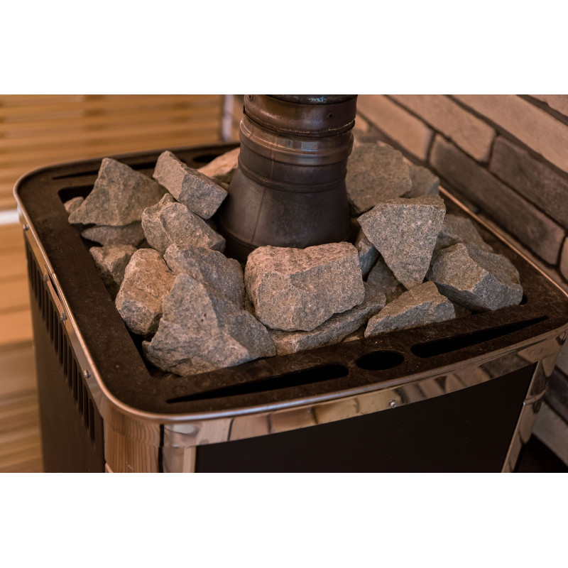 Malkas pirts krāsns - TMF KALINA VITRA. Krāsns pildīta ar jauktiem akmeņiem – somu olivīnu un šķelto žadeītu.