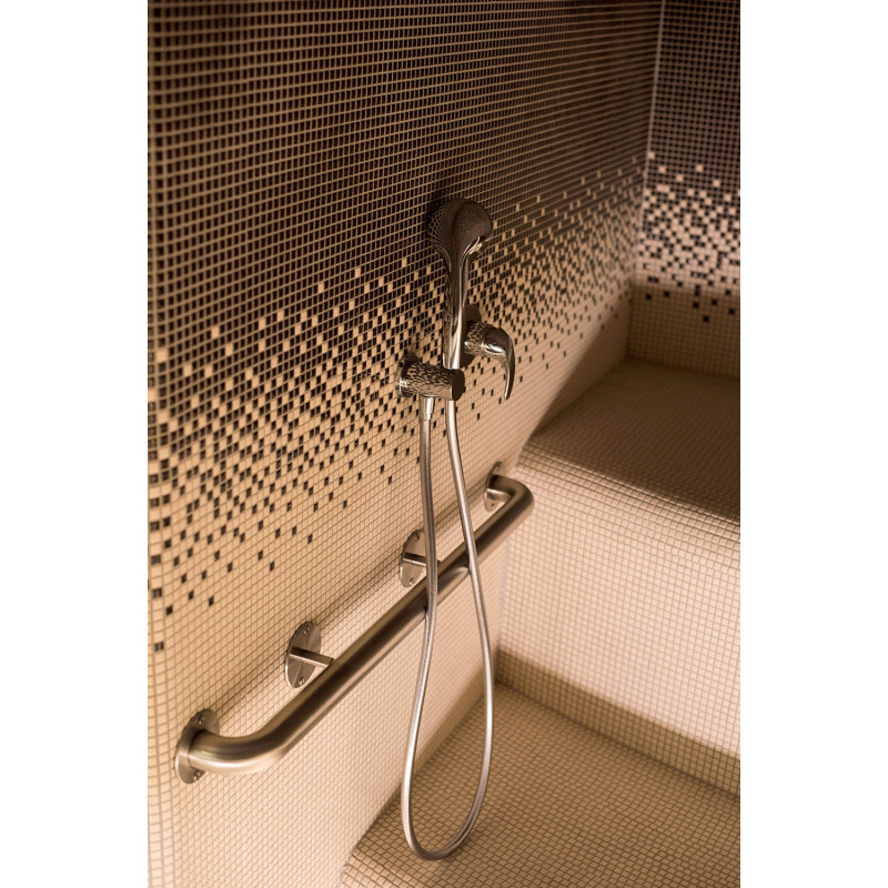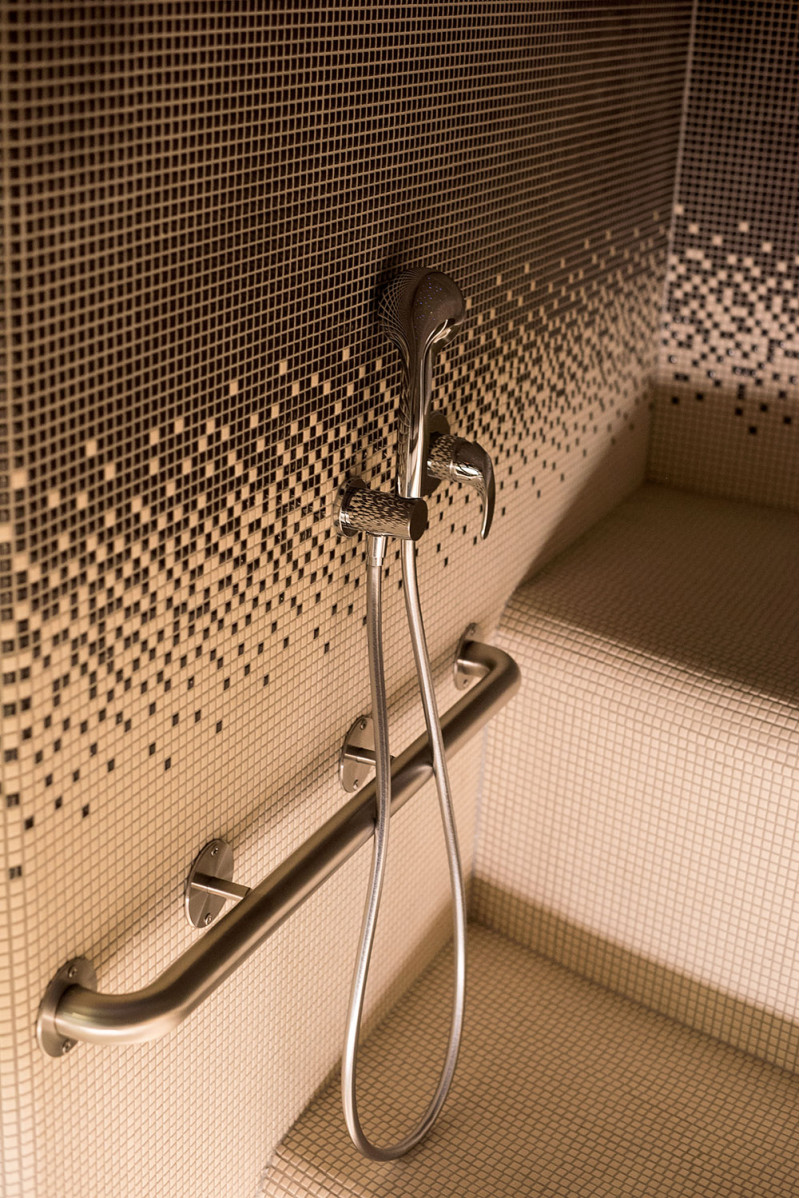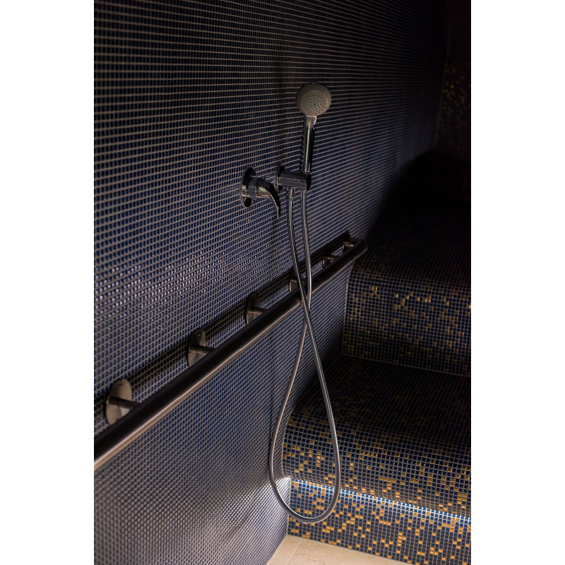 - Zem gultām ir uzstādīti mitruma un temperatūras izturīgi gaismekļi. Sienas gaismeklim stūrī tika izvēlēts atbilstošs melnalkšņa koka pārsegs.