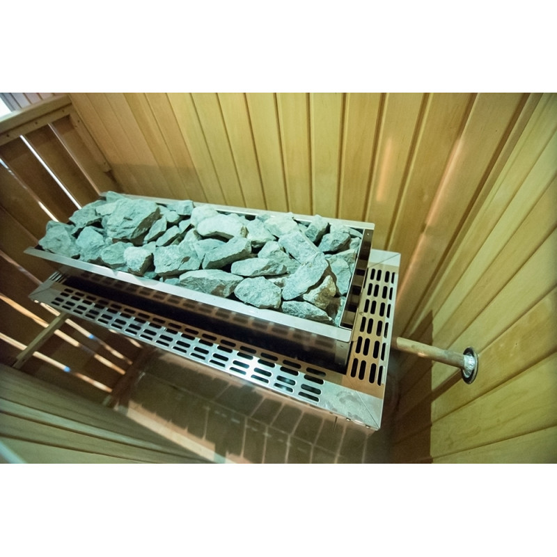 Pirts apšuvums un interjera koka detaļas ir izgatavotas no A tipa liepas koka. Sildītājam ir izveidots žogs. Koks ir piesūcināts un lakots, ieeļļots - īpaši sagatavots lietošanai karstā temperatūrā un mitrumā.