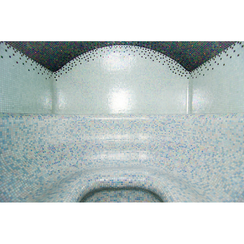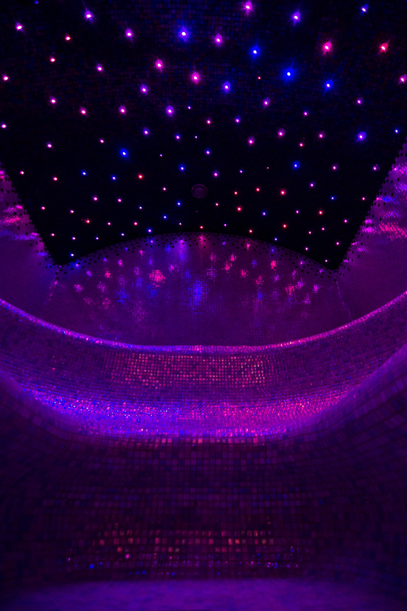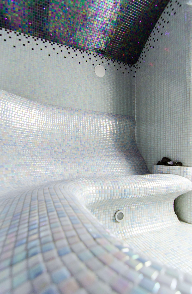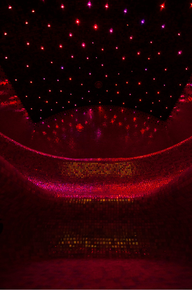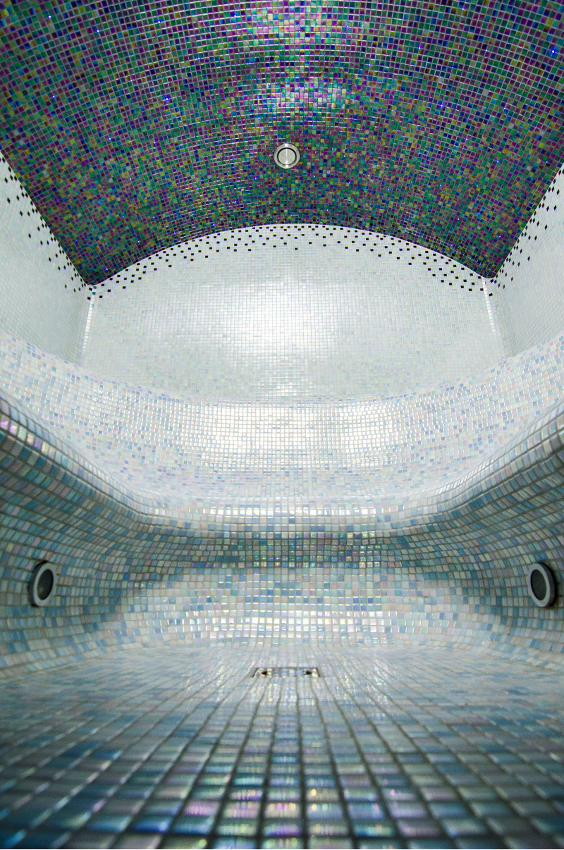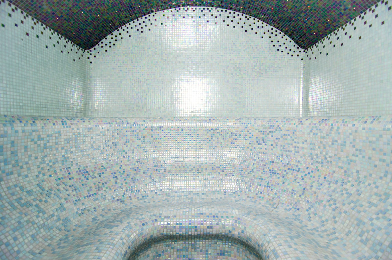 Soliņus, grīdas un sienas rotā pasteļkrāsu mozaīkas flīzes. Griesti klāti ar krāsainām flīzēm, kas kopā ar griestu apgaismojumu sniedz vēl iespaidīgāku skatu.