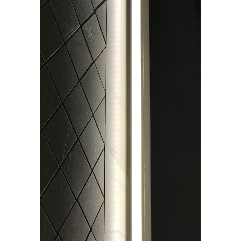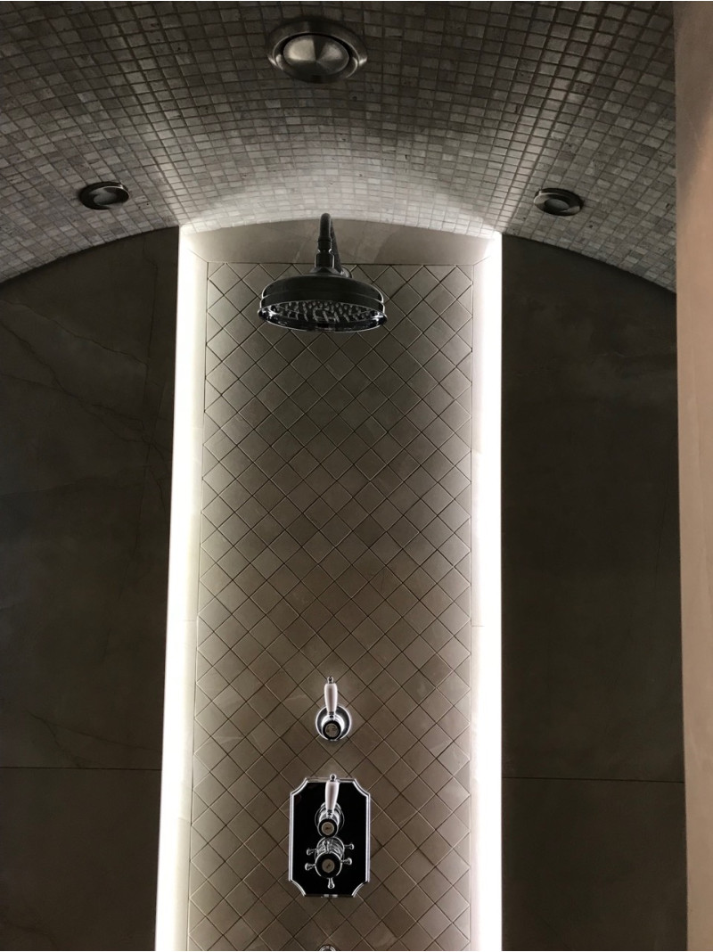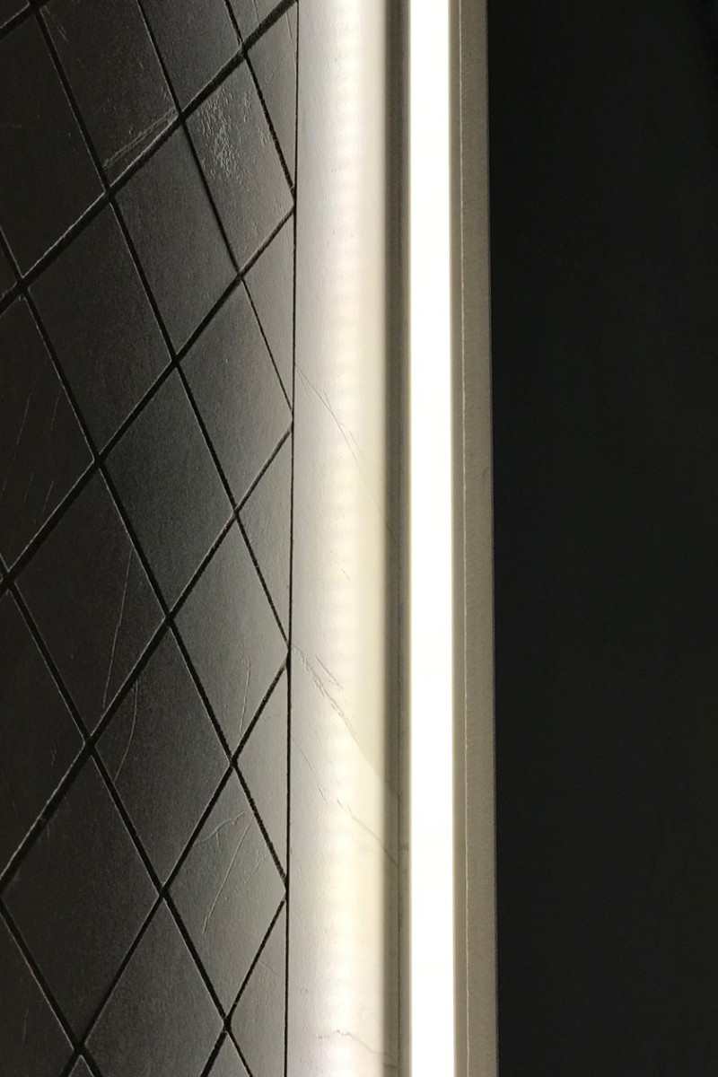 Iebūvēta LED lente zem krēsliem, pie sienām un četras lustras pie griestiem.